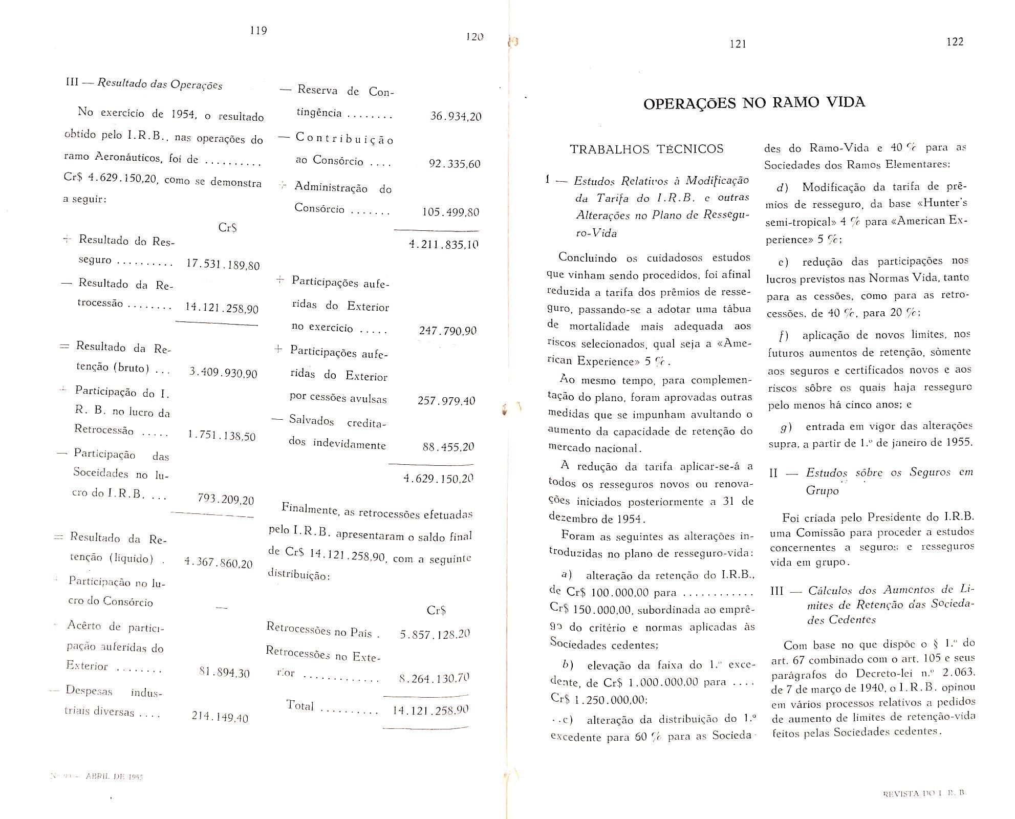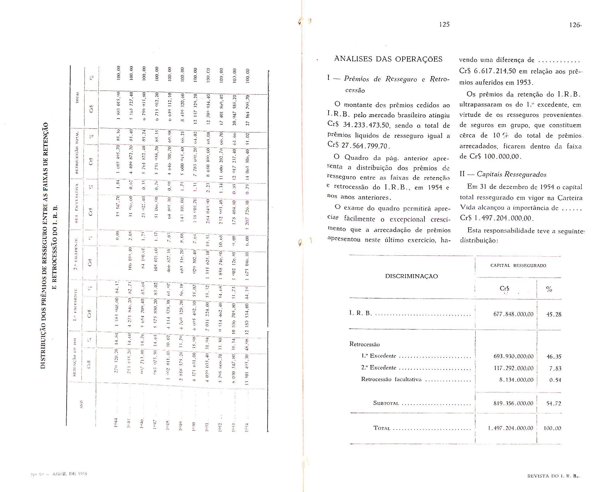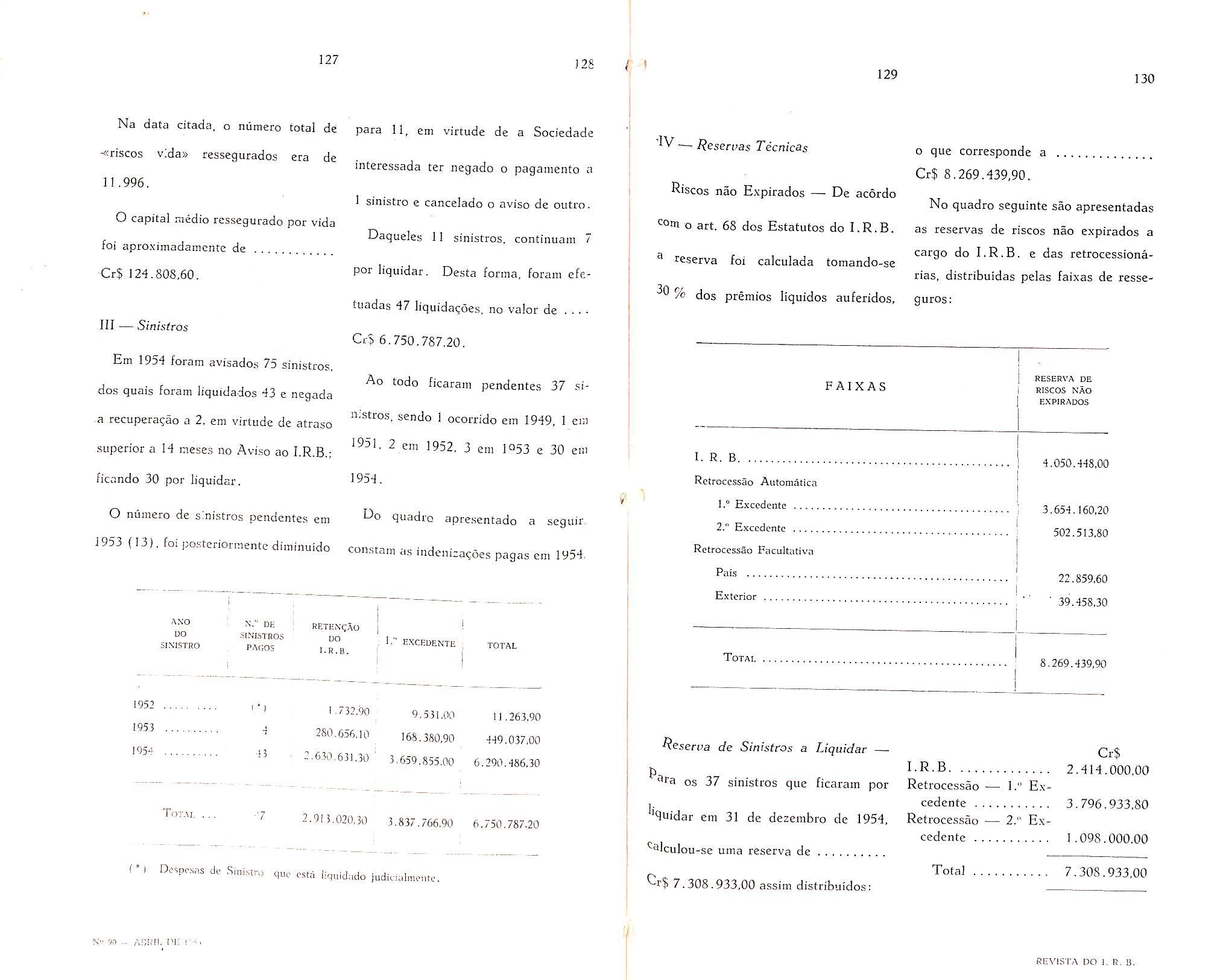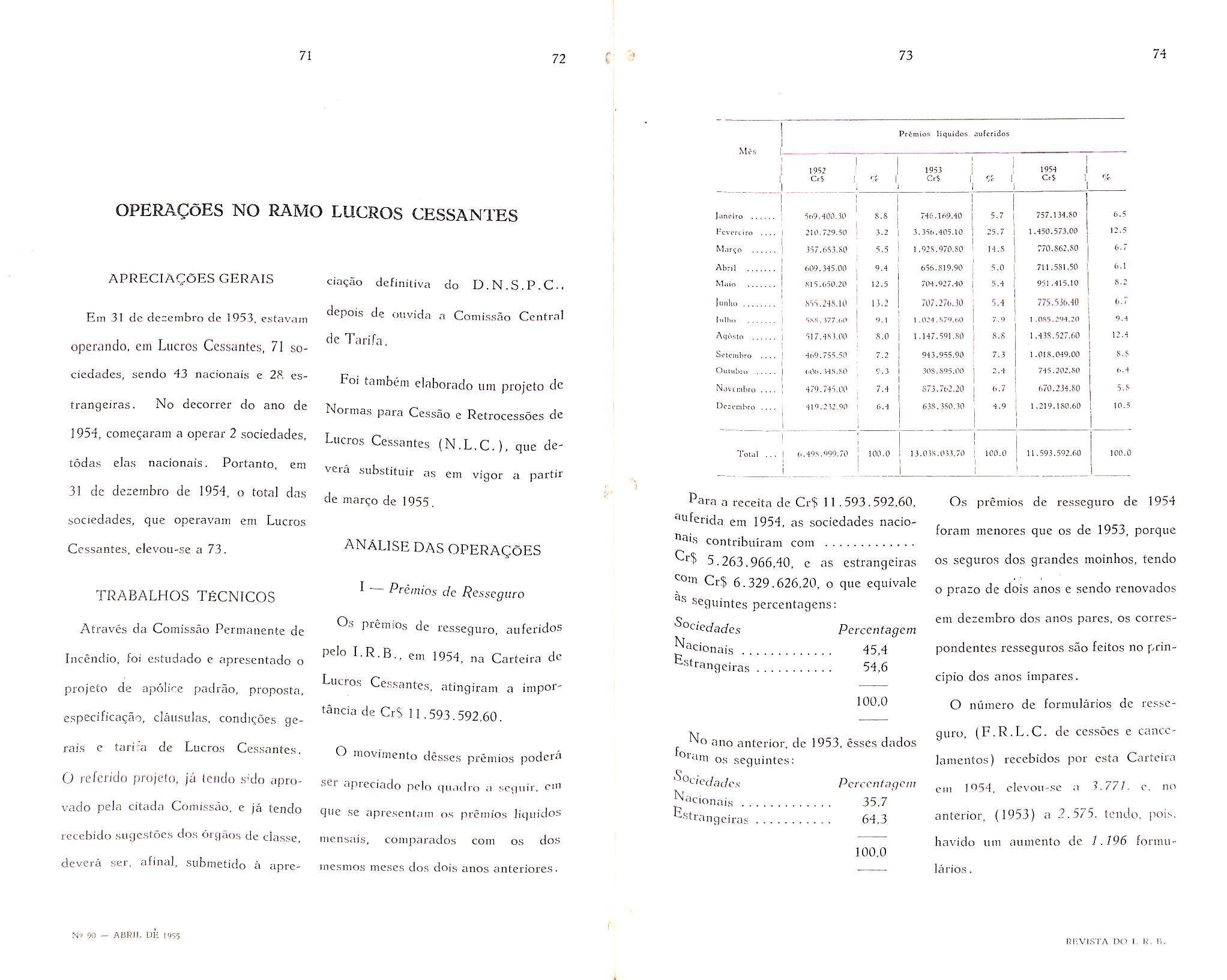 A fim de fazer face a cobertura de sens excedentes nos mercados externos, contabilizou o l.R.B. para o exterior no exercicio de 1954, premios no total de Cr$ 72,909,871,40, contra um montante de CrS 55,940.842,50 no ano anterior, o que representa um acrescimo de 30 ',f sobre o ano de 1953, Foram con.stituidas todas as reservas previstas pcla legisla^ao brasileira para as .sociedades que operam no pais.