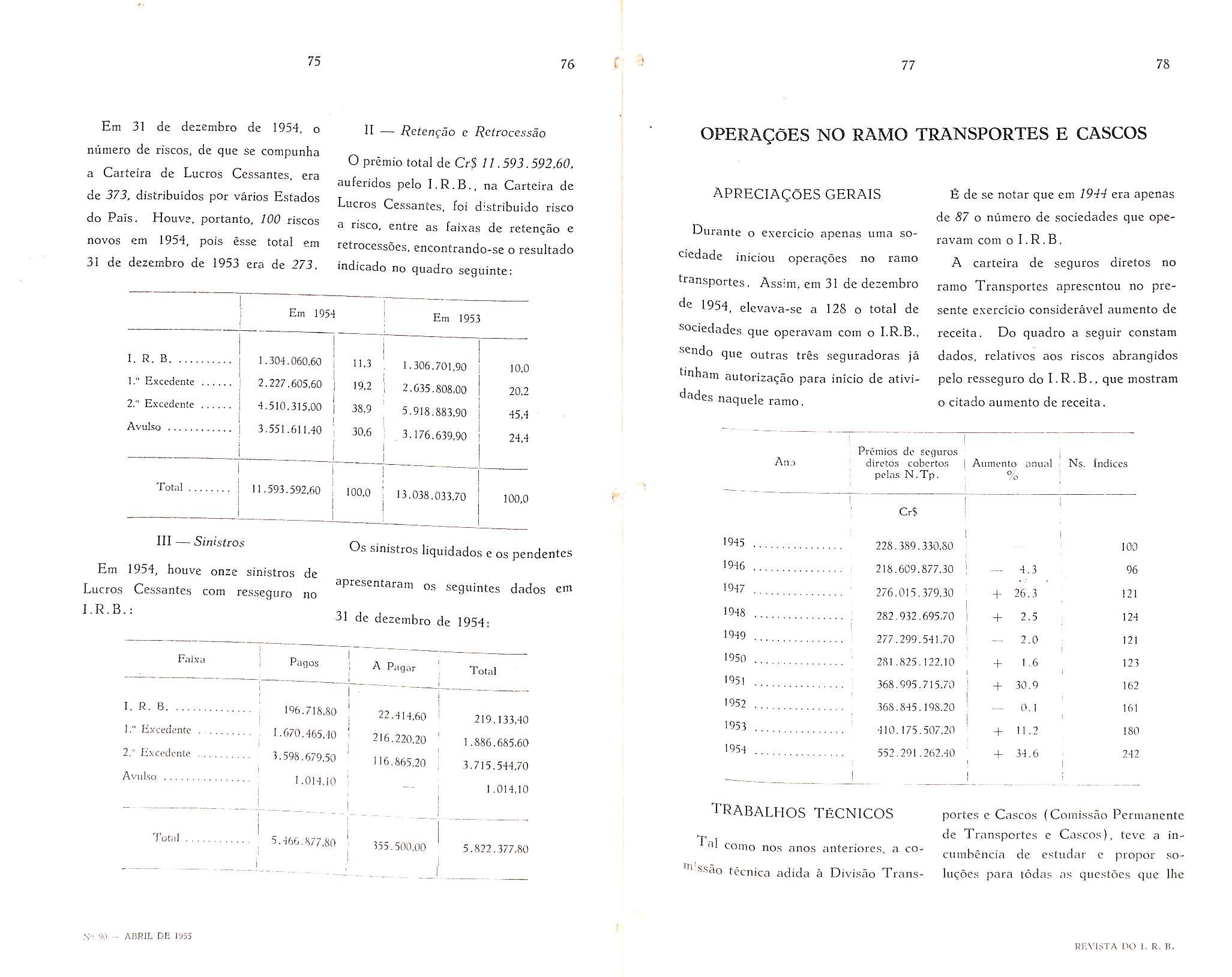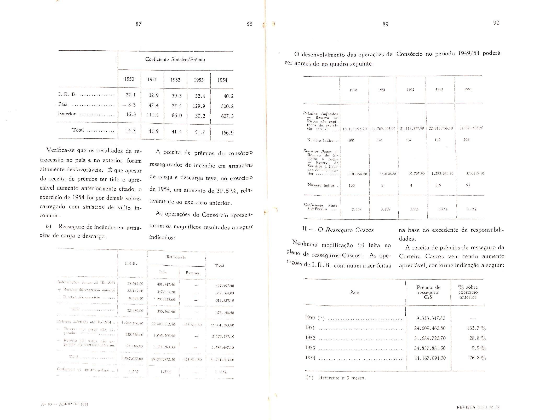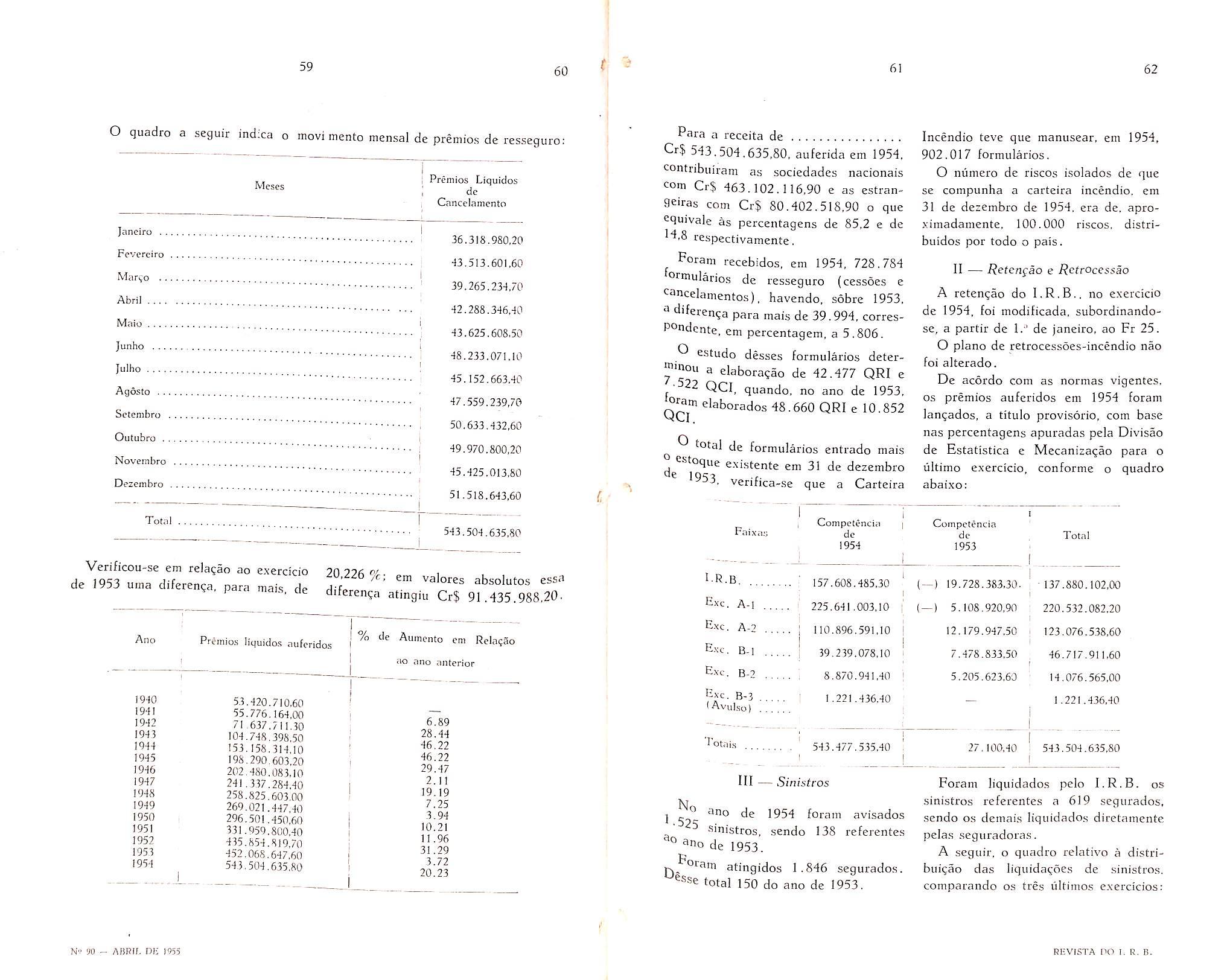 A renda de premios auhrida pelo I.R.B. cresceu de 25 fc em relagao ao exercicio de 1953, alcangando a cifra de Cr5 90^.043.239,70.
