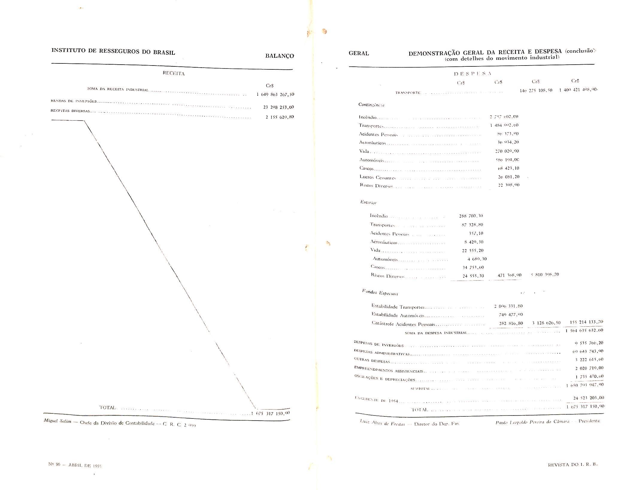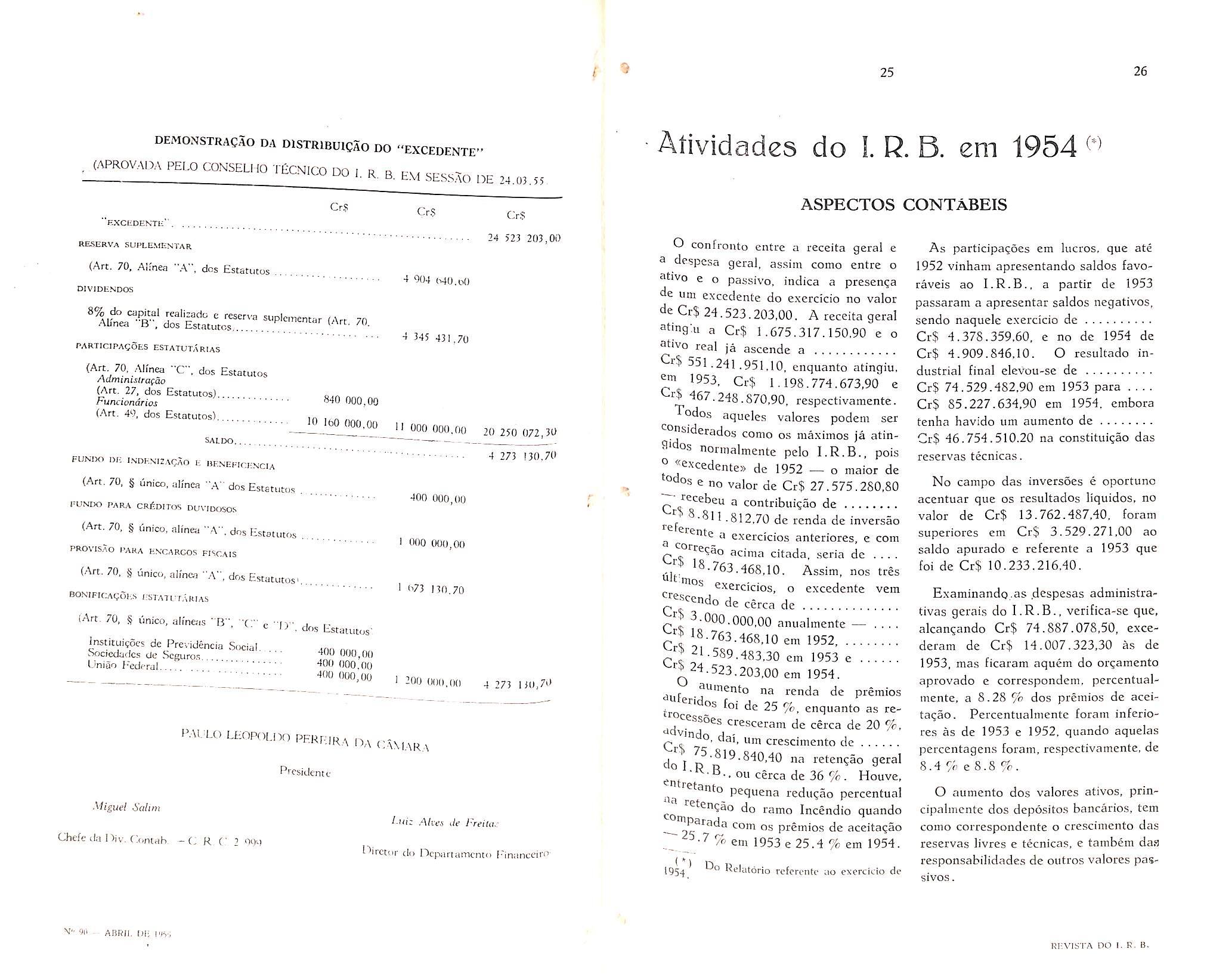 Tendo a receita geral atingido a CrS 1.675.317.150,90 e a despesa a Cr$ 1.650.793.947,90, resuUou, do exercicio de 1954, urn. cxccdente de Cr% 24.523.203.00. Rsse lucro, que so foi suplantado pelo de 1952. permitiu, apos se constituiv a reseri'a suplementar e distribuir gratificagoes, obrigatorias por lei, o pagamento de dii'idendos maximos aos acionistas, o rc/6rfo de varios [urtdos, e a concessao de participagoes a Uniao Federal, as Sociedades de Seguros e as Instituigdes de Previdincia 5ocia/.