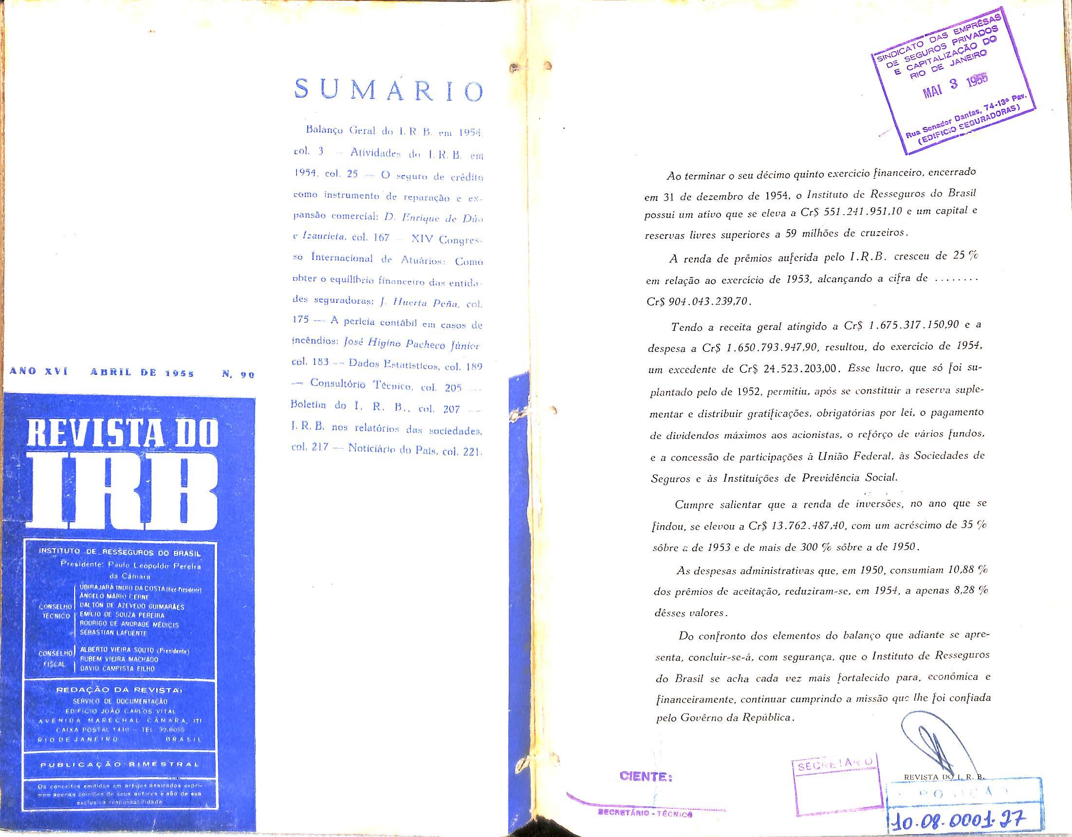 nico e Instrugoes foi entregue a Administraqao do I.R.B. dentro do prazo estabelecido. Depois de submetido a apreciagao do C.T. do I.R.B. foi autorizada a sua publica^ao no Diario Oficial, sendo publicado no dia 2 de agosto de 1954.