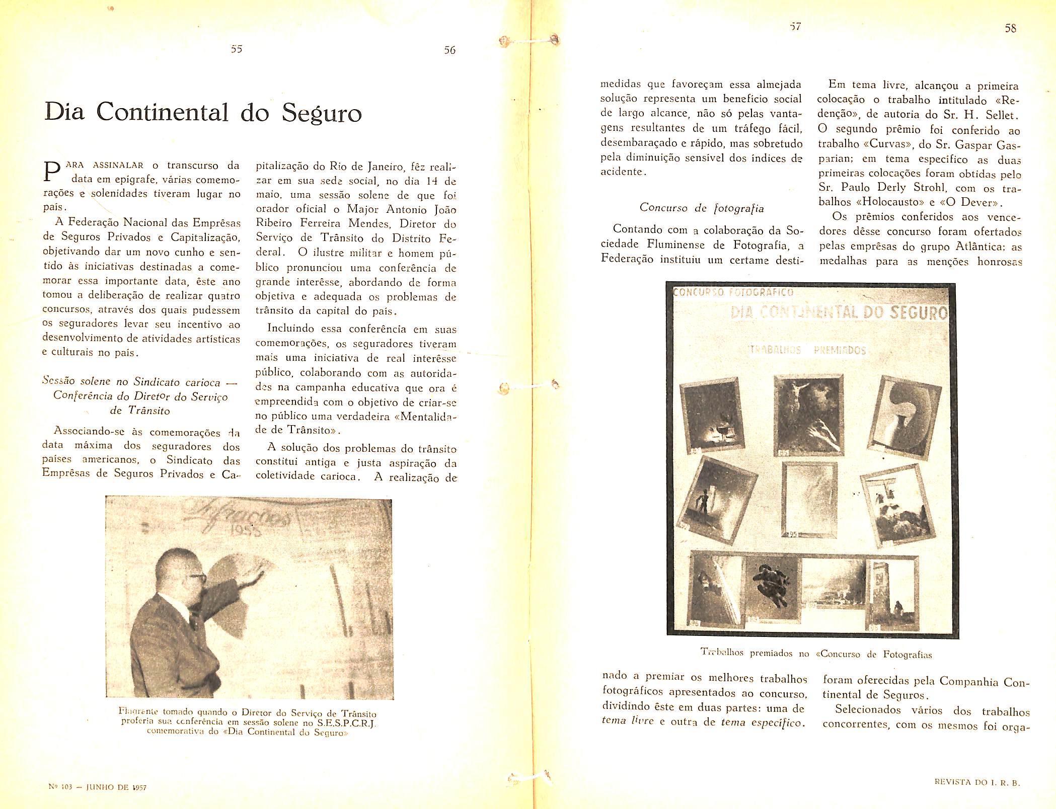 Nas fotos que ilustram esta noticia. vemos, quando discursavam, o Dr. Xavier de Lima. Presidente do I.R.B., e o Dr. Angelo Mario Cerne, Presidente da Federagao Nacional das Em presas de Seguros Privados e Capitaliza^ao; bem assim, flagrantcs da entrega dc formularies referenfes as primeiras