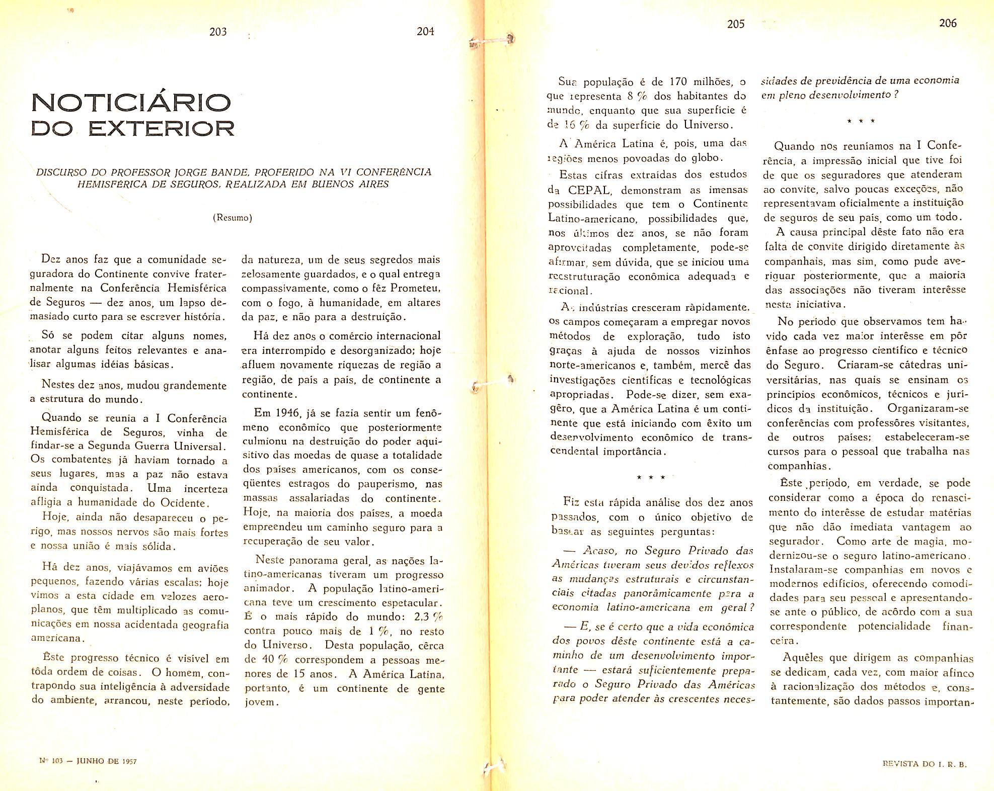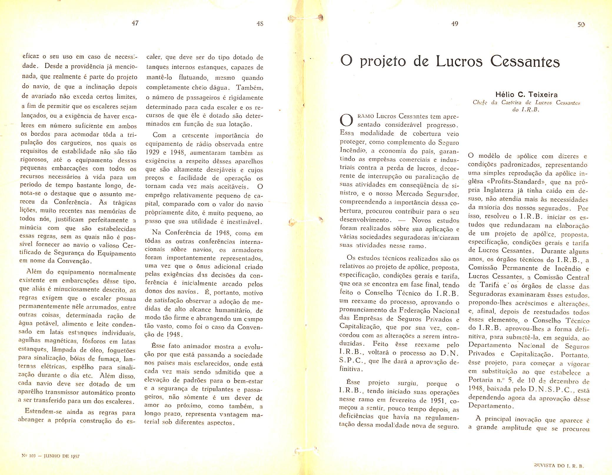 Salientou Sua Senhoria, em outra parte do seu discurso, o espirito rcinante entrc todos os Irbiarios, animados do sadio proposito de bem servir o seguro brasileiro. adiantando: «Nesse esforgo da renovagao do piano de res seguro incendio. nos, seguradores, sabemos que contamcs com a valiosa colabora^ao dos Tccnicos do I.R.B. naturalmcnte, como tudo que se faz de novo. como tudo que sc planeja, foi fruto dc muitas discussoes entre as duas entidadcs interessadas*.