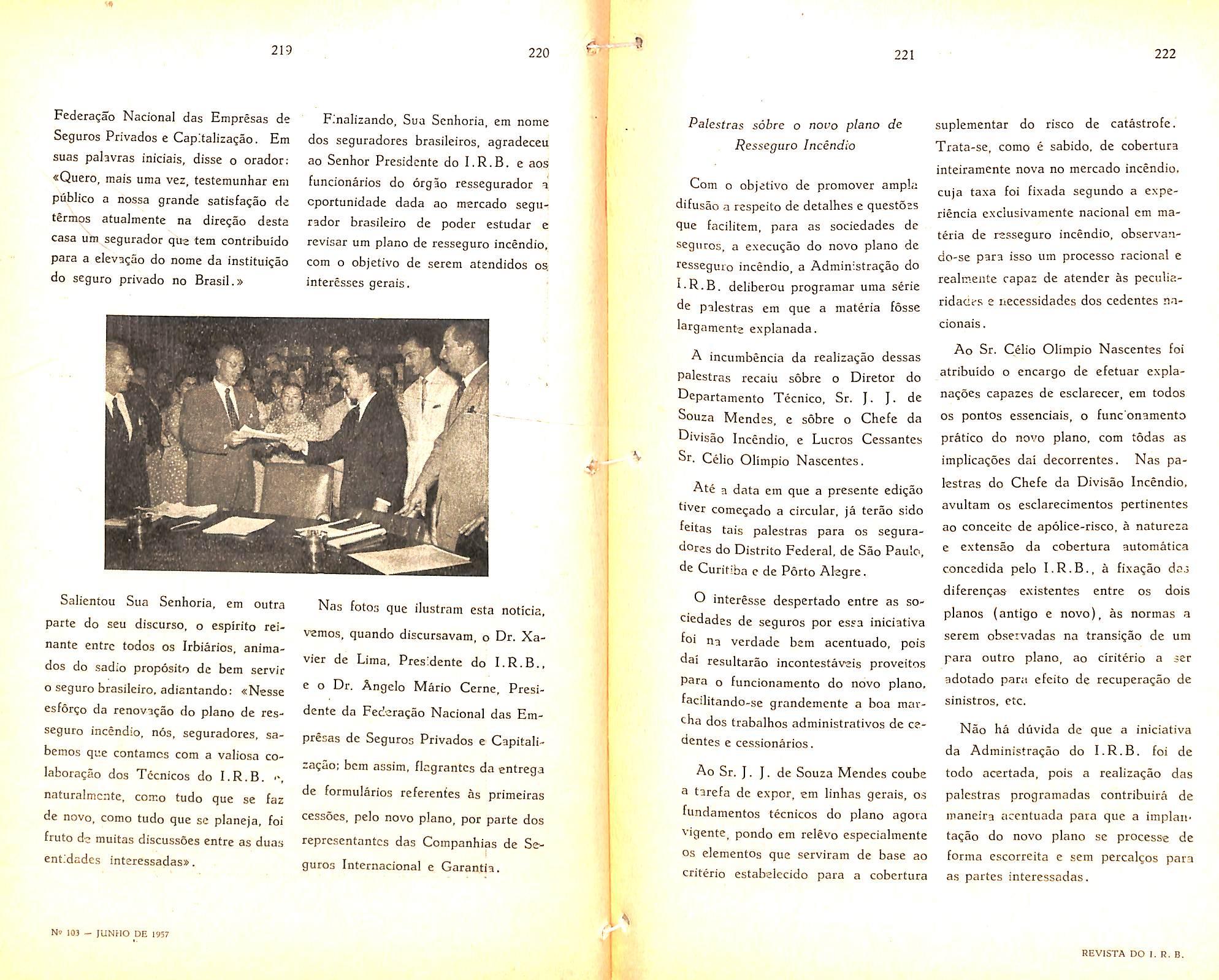 No dia 2 de maio do ano em curso, em soicnidade realizada na sala de sess5es do Conselho Tecnico, teve lugar a entrcga dos formularios referentes as primeiras cessoes efetuadas nos termos e ccndicjcs do Piano de Rcsseguro Incendio, cuja vigencia se iniciou em 1.® de abril ultimo.