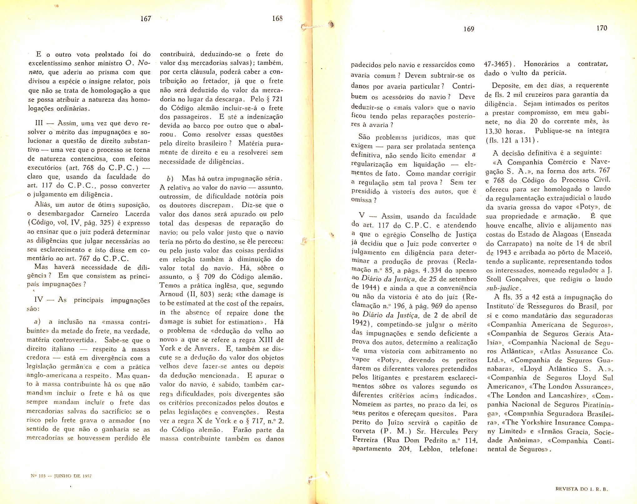 A ciencia do seguro: /. /. dc Souza Mendes. col. 29 — A salvaguarda da vida humana no mar; Jose Critz San tos, col. 39 — O projeto de Lucres Cessantes: Helio Teixeira, col. 49 Dia Continental do Seguro, col. 55 — «Premiar, recordar e trabalhar pelo direito em nossa terras; Angela Mario Cerne, col. 67 — «Estiniulo ao estudo de problemas juridicoss; David Campista Filho, col. 73 — A evolmjlo da cobertura automatica no ramo incendio; Ce/i'o O. hJascentes. col. 79 TESES ; Seguro de vida — Necessidades e vantagens de incorporar o seu conhecimento metodologico e permanente no ensino primario, secundario c universitario: Luiz D. Calvino, col. 89 — O resseguro-vida a premie original ou a premie de risco na Republica Argentina; Gerardo W. Hahn, col. 105 — Scguros de acidentes e doen^a sub-normal; Delegagao dos E.U.A., col. 115 — Dados Estatisticos, col. 135 — Tradu^oes e Transcri^oes : Alguns elementos sobre a atividade seguradora em Portugal e no Brasil; Rui Jorge da Silva Ramos, col149 — Pareccres e Decisoes, col. 163 — ConsuIt6rio Tecnico, col. 179 Boletim do I.R.B.; col. 181 — Noticiario do Exterior, col. 203 — Noticiario do Pais, col, 211 .