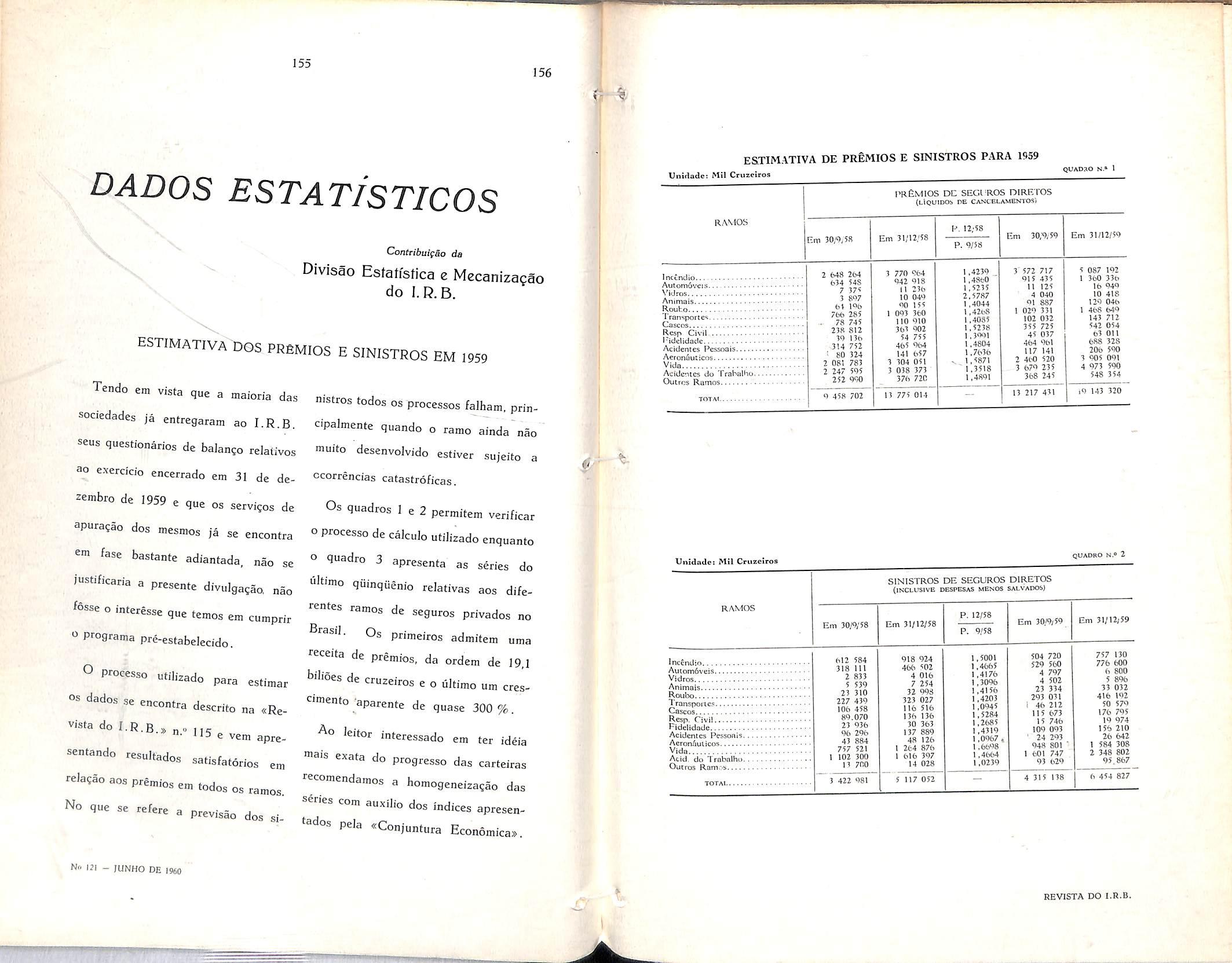 Dados Estatisticos: Estimativa de prfi' mios e sinistros em 1959. col. 155 Boletim Informative da D.L.S., col. 161 — Boletim do I.R.B., col. 167