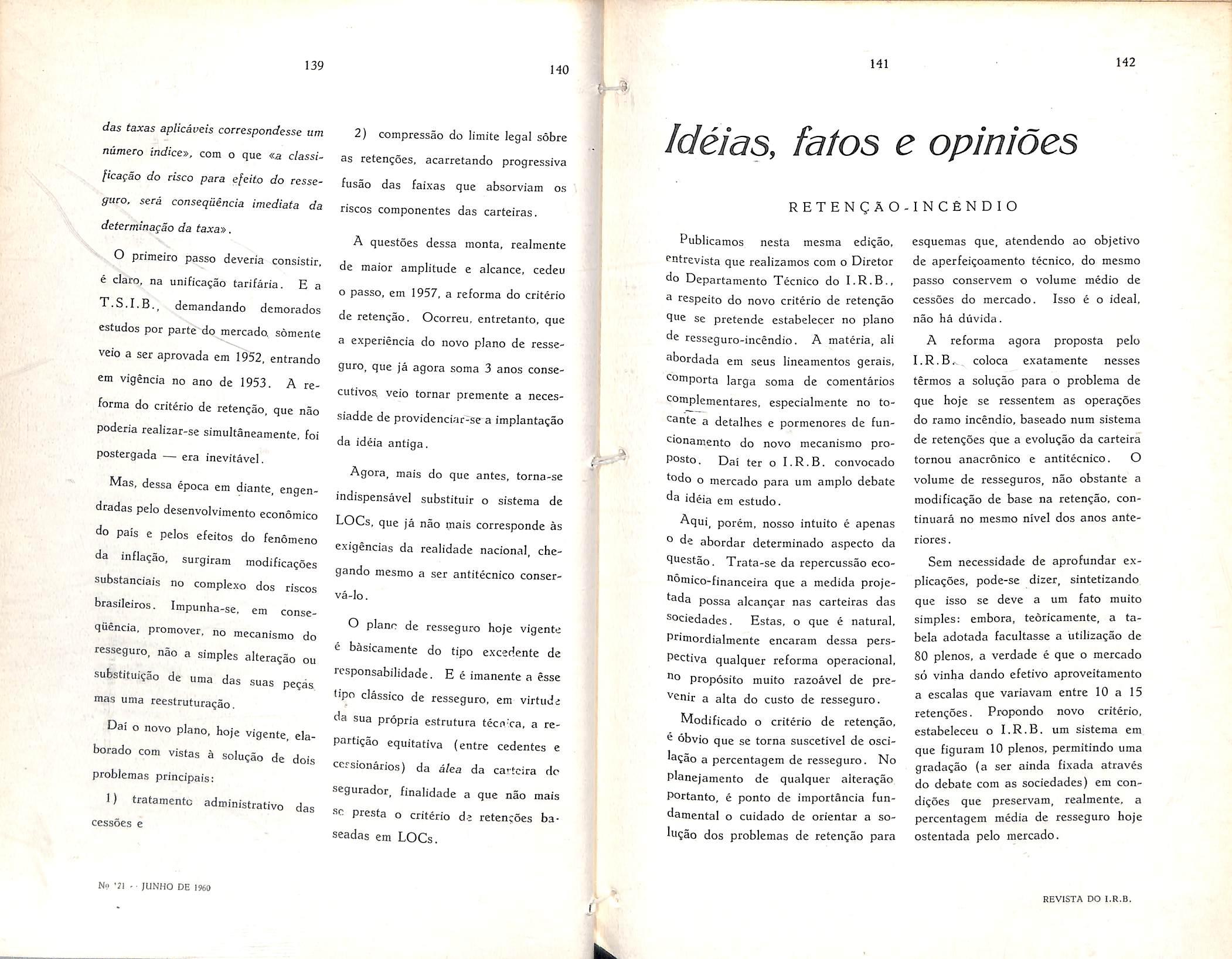 Complementa^Io da reforma do piano incendio: entrevista; /. J. de Souza Mendes, col. 3 — Comemora o Instituto de Resseguros do Brasil o seu 21.° aniversario, col. 9 — 20." aniversario da D.I., col. 15 — Homenagem a um segurador, col 25 — Introdu^ao a teoria matematica do Seguro: