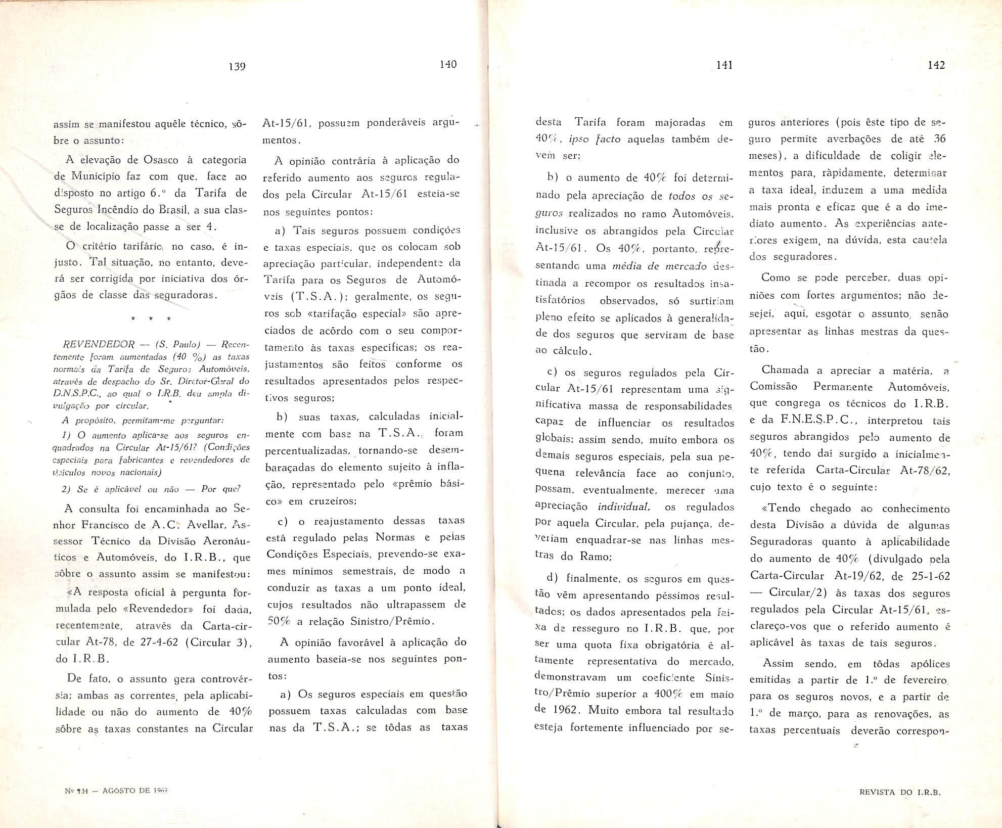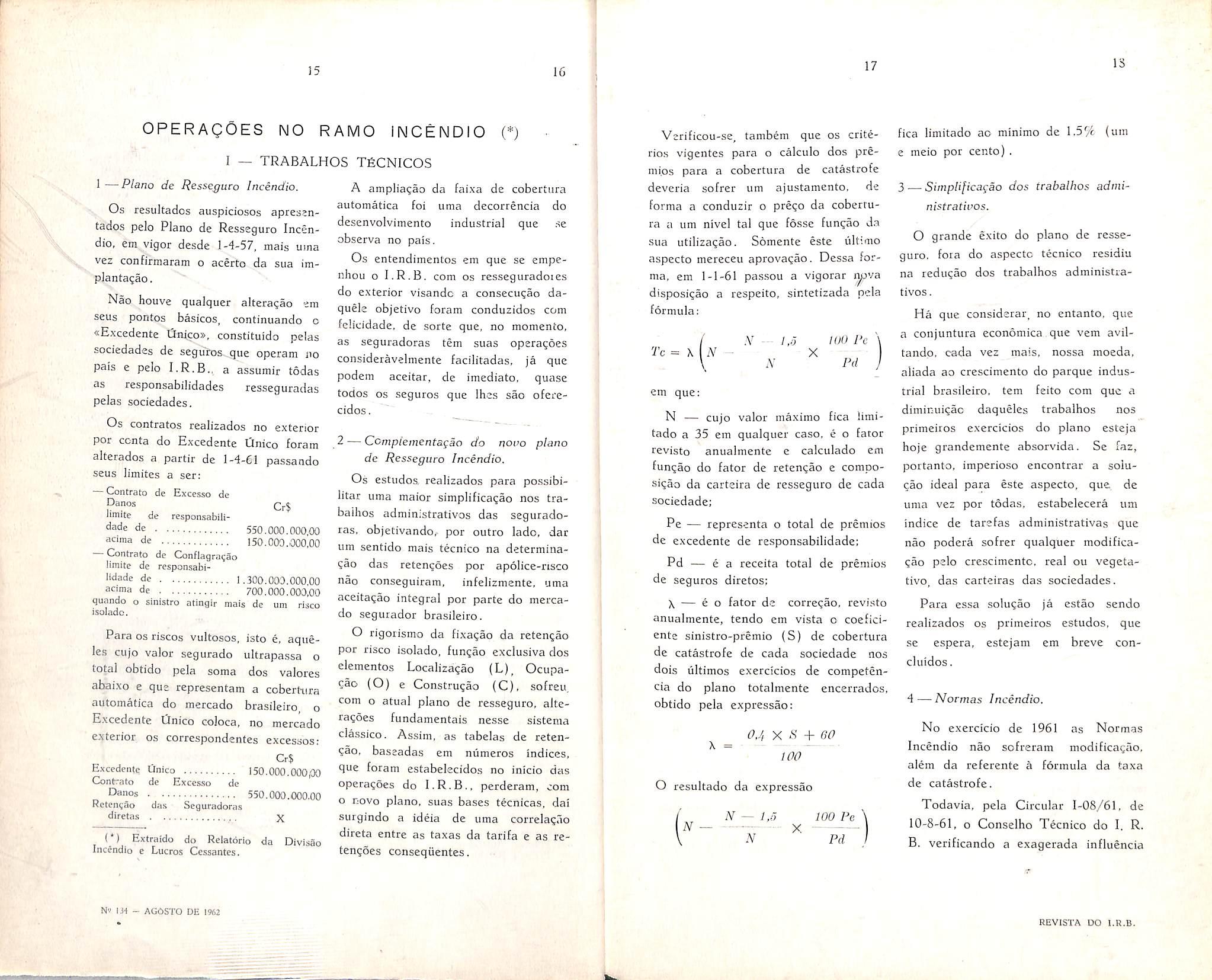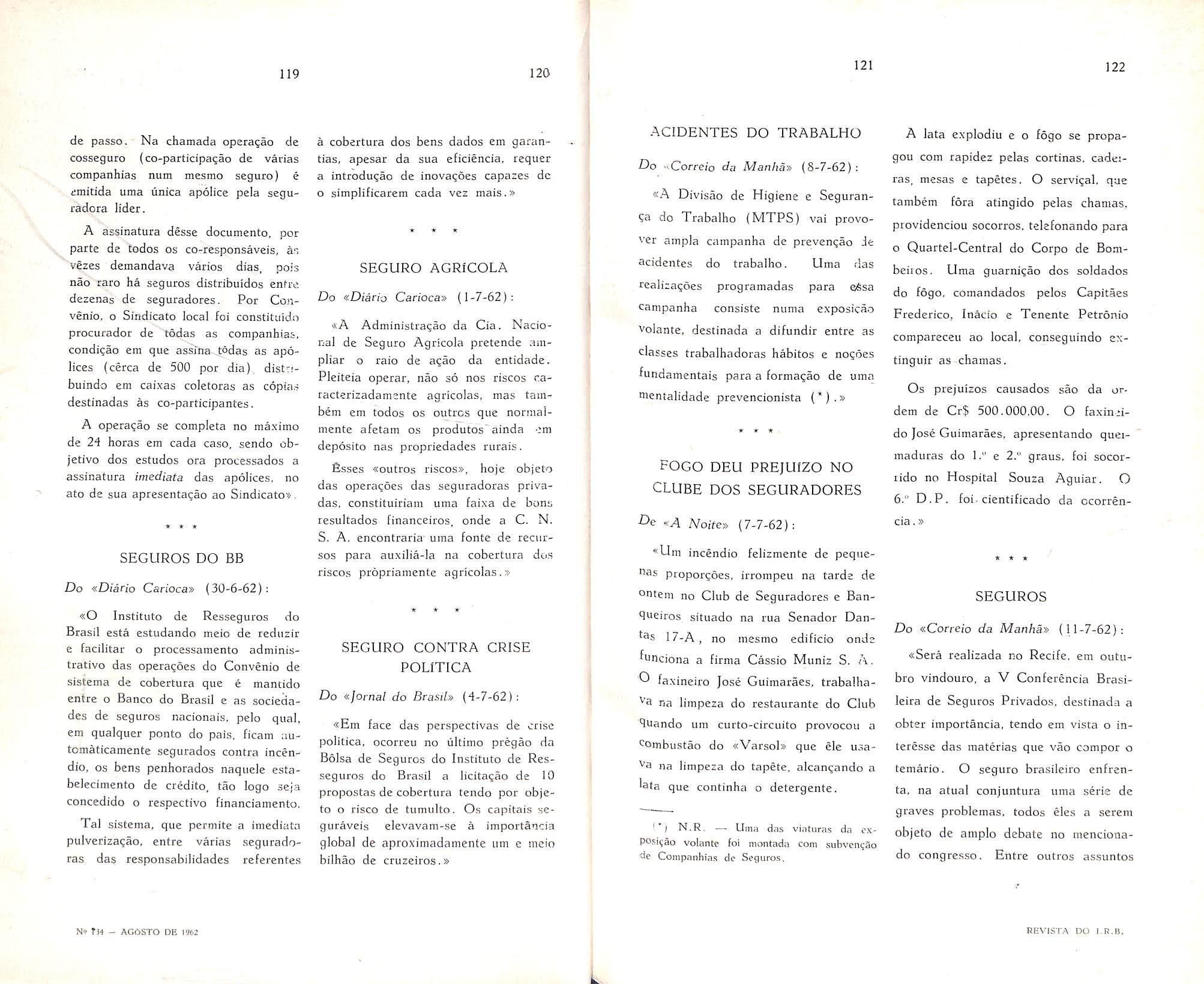 Atividadcs do I.R.B. em 1961: Aspectos Contabeis, col. 3; Opcra^Scs no Ramo Incendio, coi. 15 — Mcrcado Segurador Bra.sileiro — 1961 (grafico). col. 29 — Scguro.s de cascos da frota «Na^6es». do Loide Brasilelro; depoimento: Oyama Pcreica Teixeira. col. 31 — Cobranga de premio: ur.ia sugestao: Pedro Pinheiro Guimarae<. col. 61 — Estatistica aplicada a scle9ao e preven^ao de riscos: Urbano de Albuquerque, col. 65 — Produ^ao do seguro no Brasil: Milton de Oilveira Castellar. col. 73 — A contiibui^ao europeia para a cria^ao do Direito dos Seguros e as tarefas da A.I.D.A. tese: Antigono DomUi. col. 81 — Preven^M "de acidente.s na industria de madeira — protegao do homem e da maquina na fabricagao de viscose: tese: Antonio Gongalves da Silva, col. 97 — Ideias fatos e opinioe.s. col. Ill — Imprensa em Revista, col. 117 — Pareceres c Decisocti, col. 125 — Consultdrio Tficnico, col. 135 — Dados Estatisticos: Balan^os das socicdades de sequros, col. 145 — Boletim Informativo da D.L.S., col. 163 — Boletim do I.R.B,, col. 167 — Noticiario dos Tres Poderes. col. 179 — Noticiario do Exterior, col. 185 — Noticiario do Pais, col. 187 — Necrologios: Antonio Regis da Silva e Theophilo Ottoni Pacheco col. 191.
