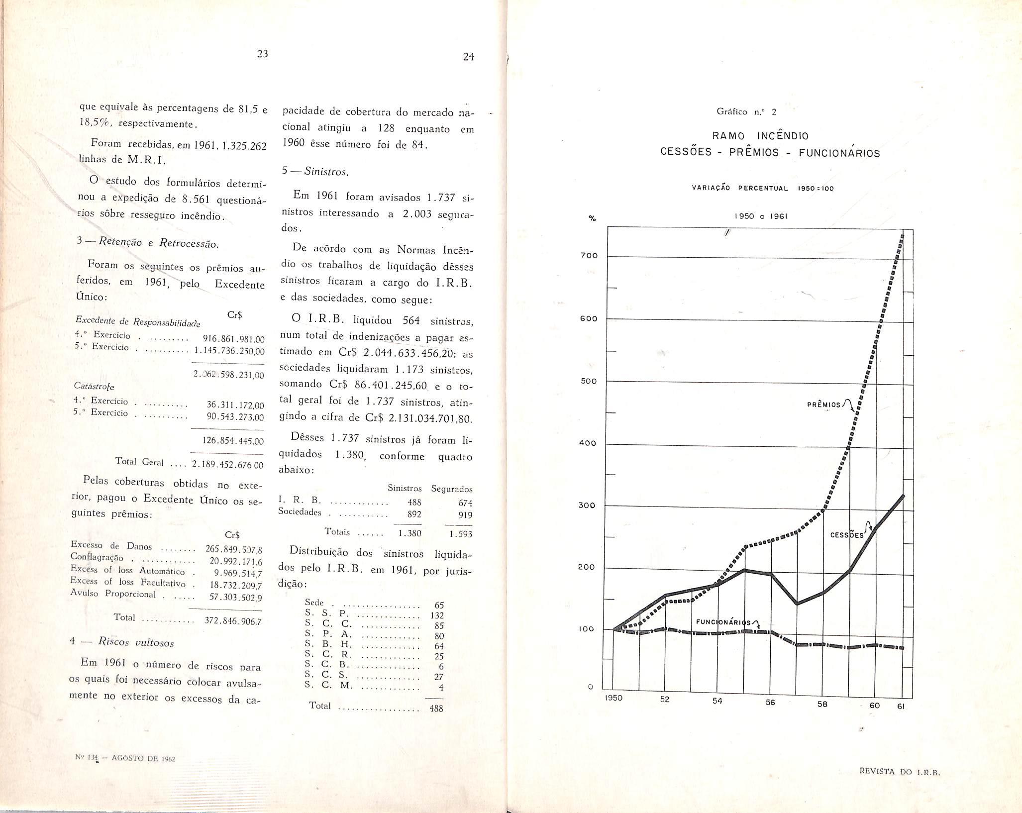 2 — A soma da receita bruta do I.R.B. atingiu em 1961 a cifra de Cr$ 8.779.682.674,60, contra Cr$ 6.297.008.672,80 em I960. Os