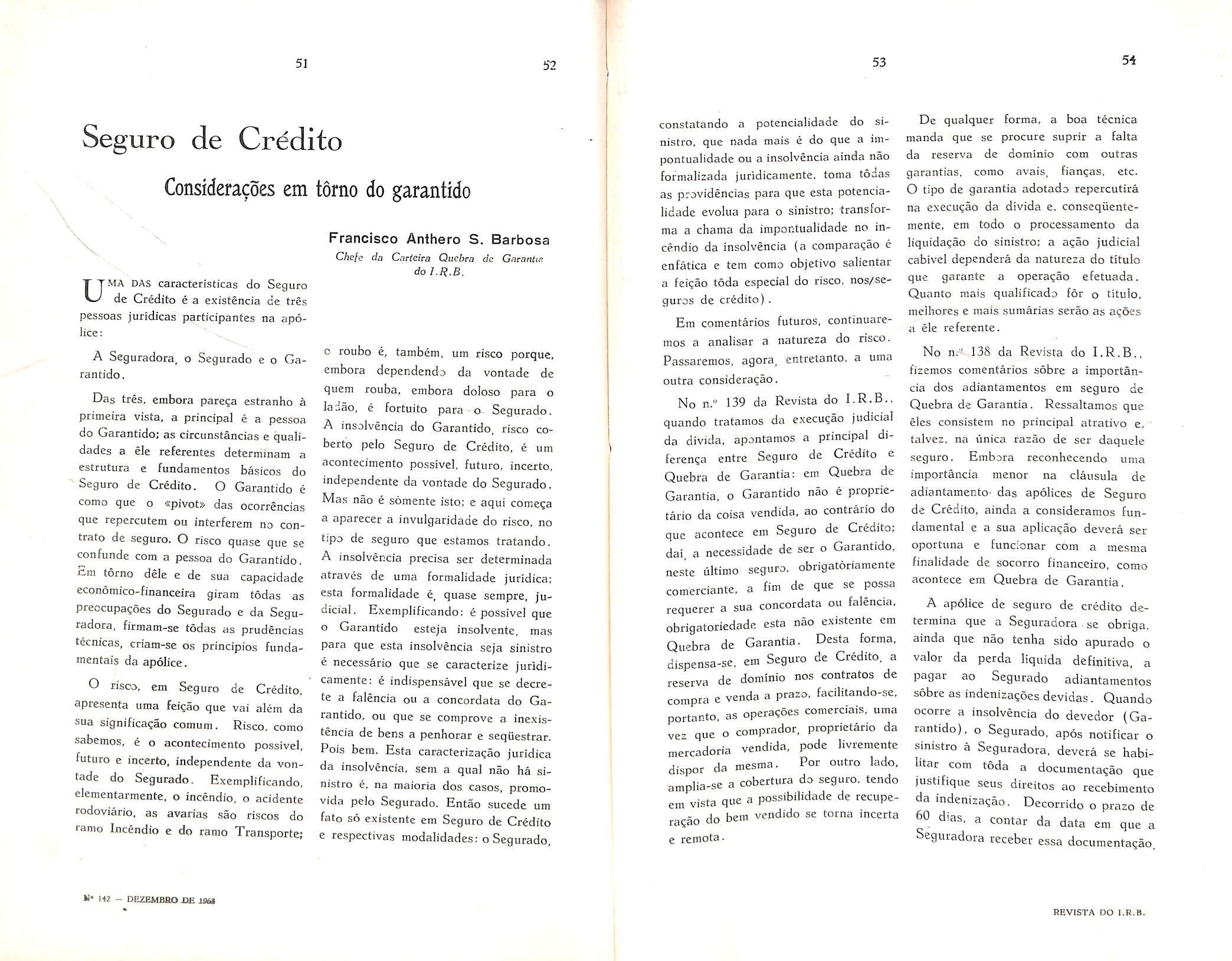 CREDIT Insurance — Comments on the First Year of I.R.B. operat ons — Report; Considerations Regarding the Guaranteed Debtor — Francisco A. Barbosa — n,® 140, col. 33 — n." 142. col. 51. D