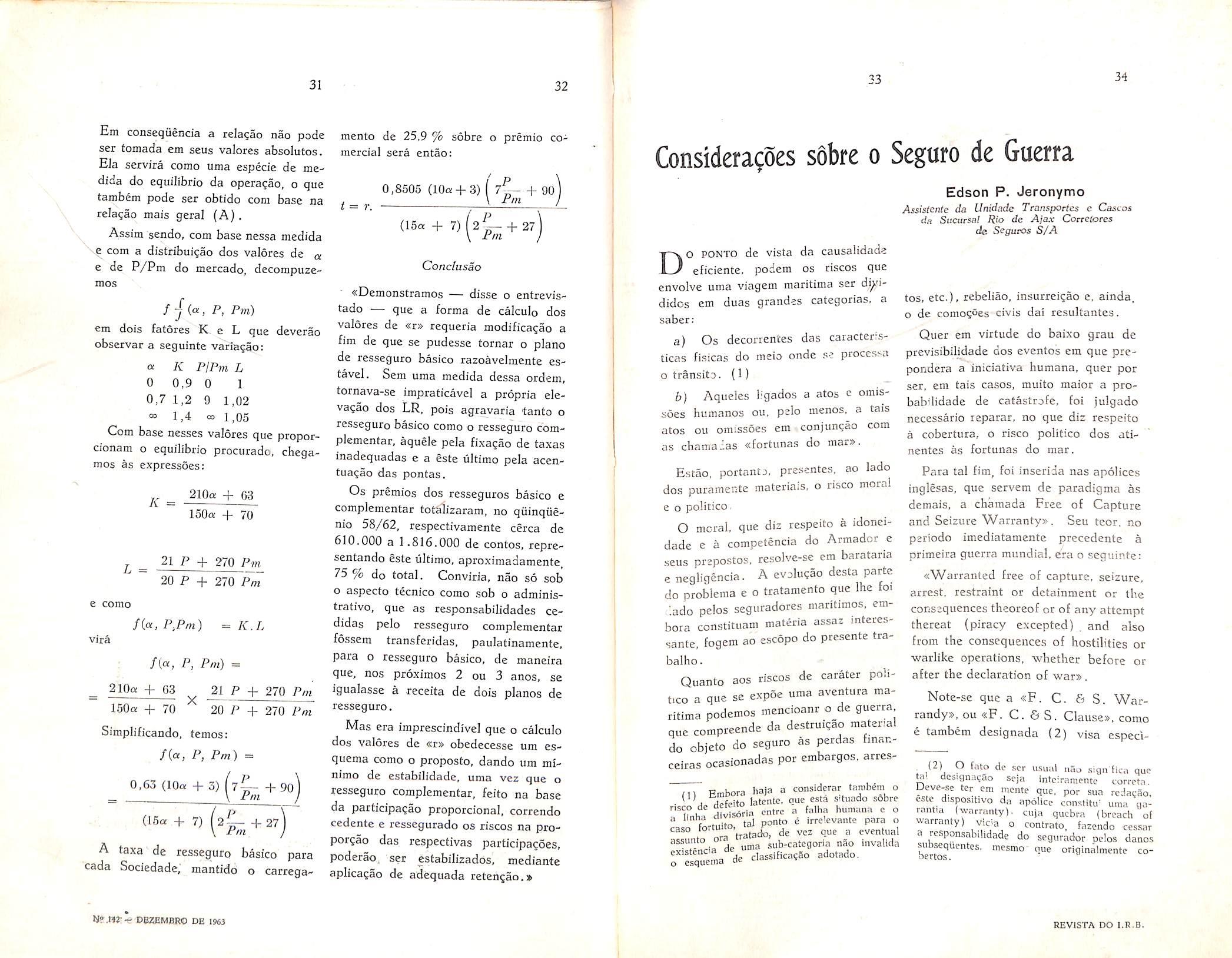 Transportes; Razoes do novo crit^fio estabelecido para o calculo da taxa de resseguro basico; Alfredo CarAo^s tanajr..col.15—Considera?6essobre o seguro de guerra: tradugao; fdsr"" P.feronymo. col. 33 — Seguro de ere dito;Considera^oesemtornodoga^a" tido;Francis<ioA.S.Barbo^B,col.