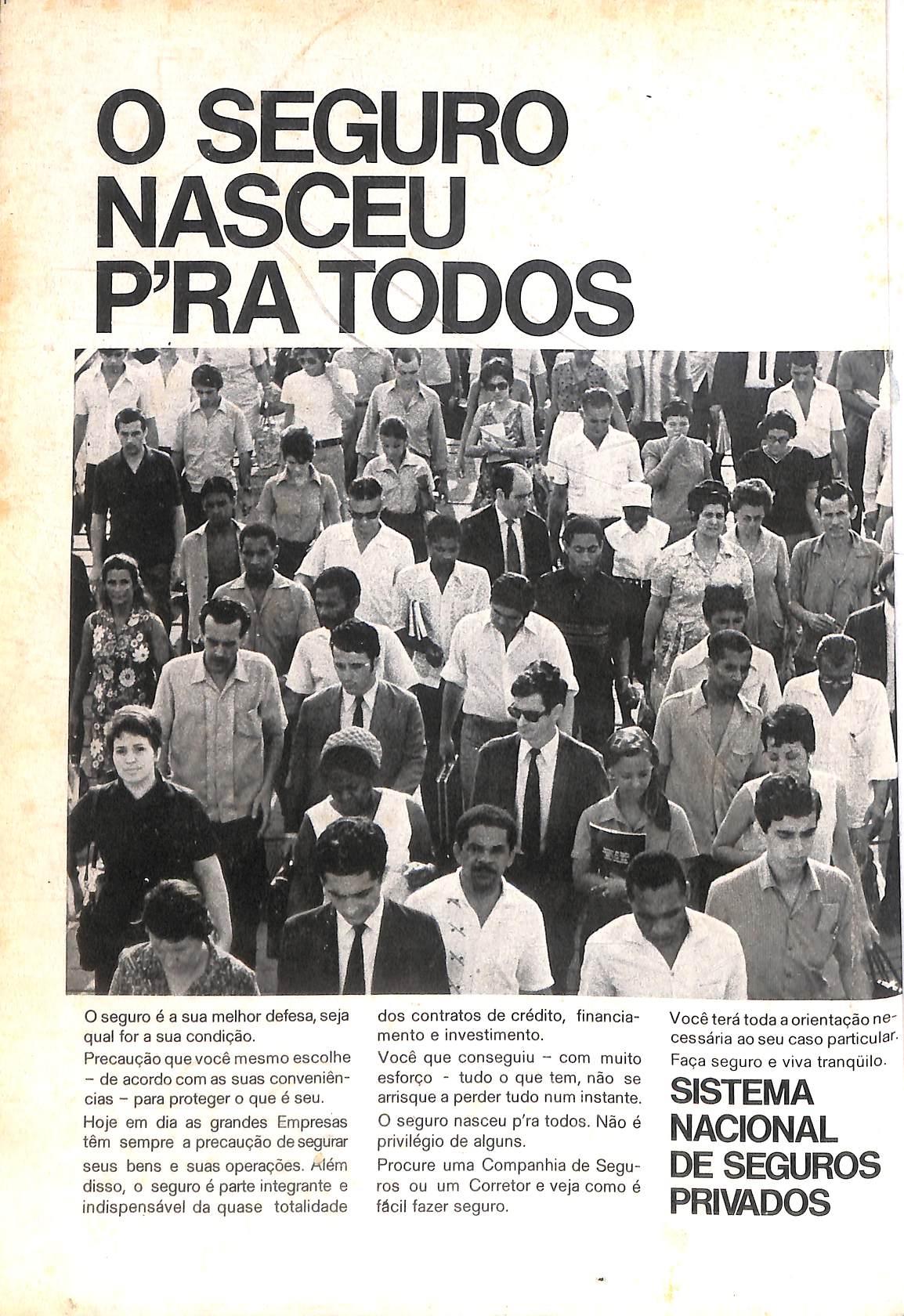 A constatacao de que, em outros sistemas economicos, a relacao seguro/pro^uto nacional atingia eievadas taxas, induziu e justificou a pretensao de que iguai "performance" se reproduzisse no contexto brasiieiro. Neste, para tanto, a ocorrencia de condigoes plenamente favordiveis. Uma delas 6 a 6bvia existencia de iargas faixas de procura iatente do seguro, em todos OS segmentos do mercado; outra e o excepcionai desempenho da economia nacional, caracterizado per aitos Indices de crescimento que se manterao nos prdximos anos.