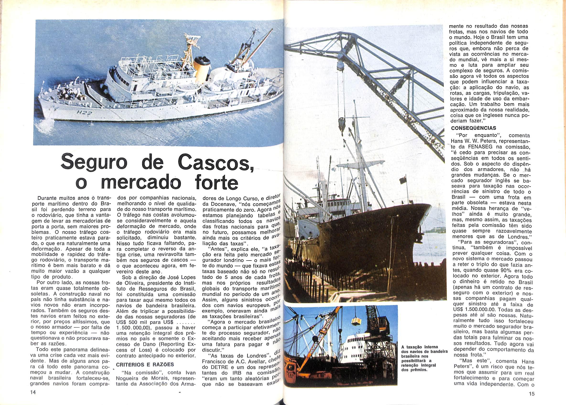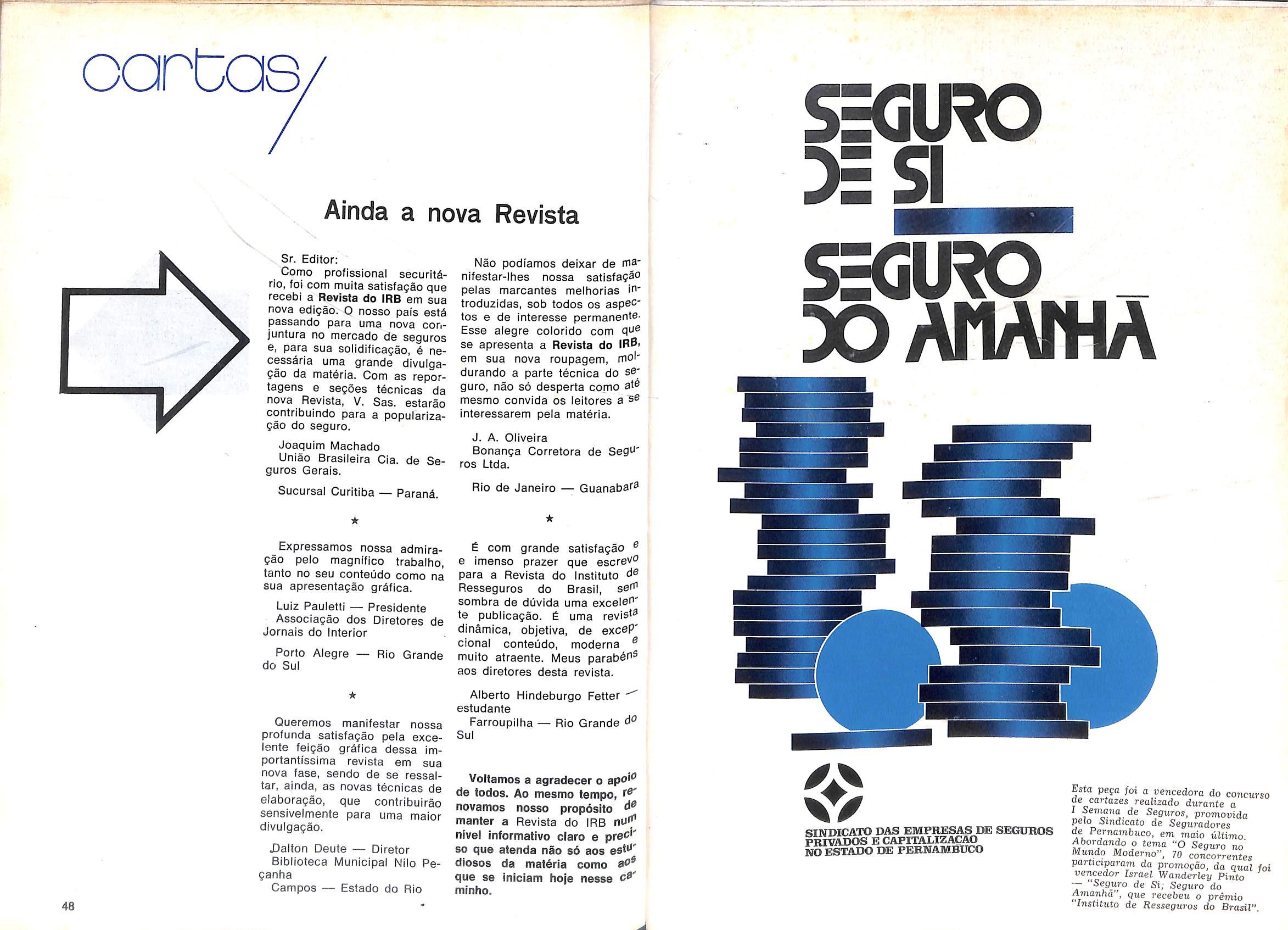Nao podiamos deixar de manifestar-lhes nossa satisfagS" pelas marcantes melhorias troduzidas, sob todos os aspeC' tos e de interesse permanenteEsse alegre colorido com c\os se apresenta a Revista do em sua nova roupagem, rrioldurando a parte tScnica do se guro, nao so desperta como at^ mesmo convida os leitores a s® interessarem pela materia.
