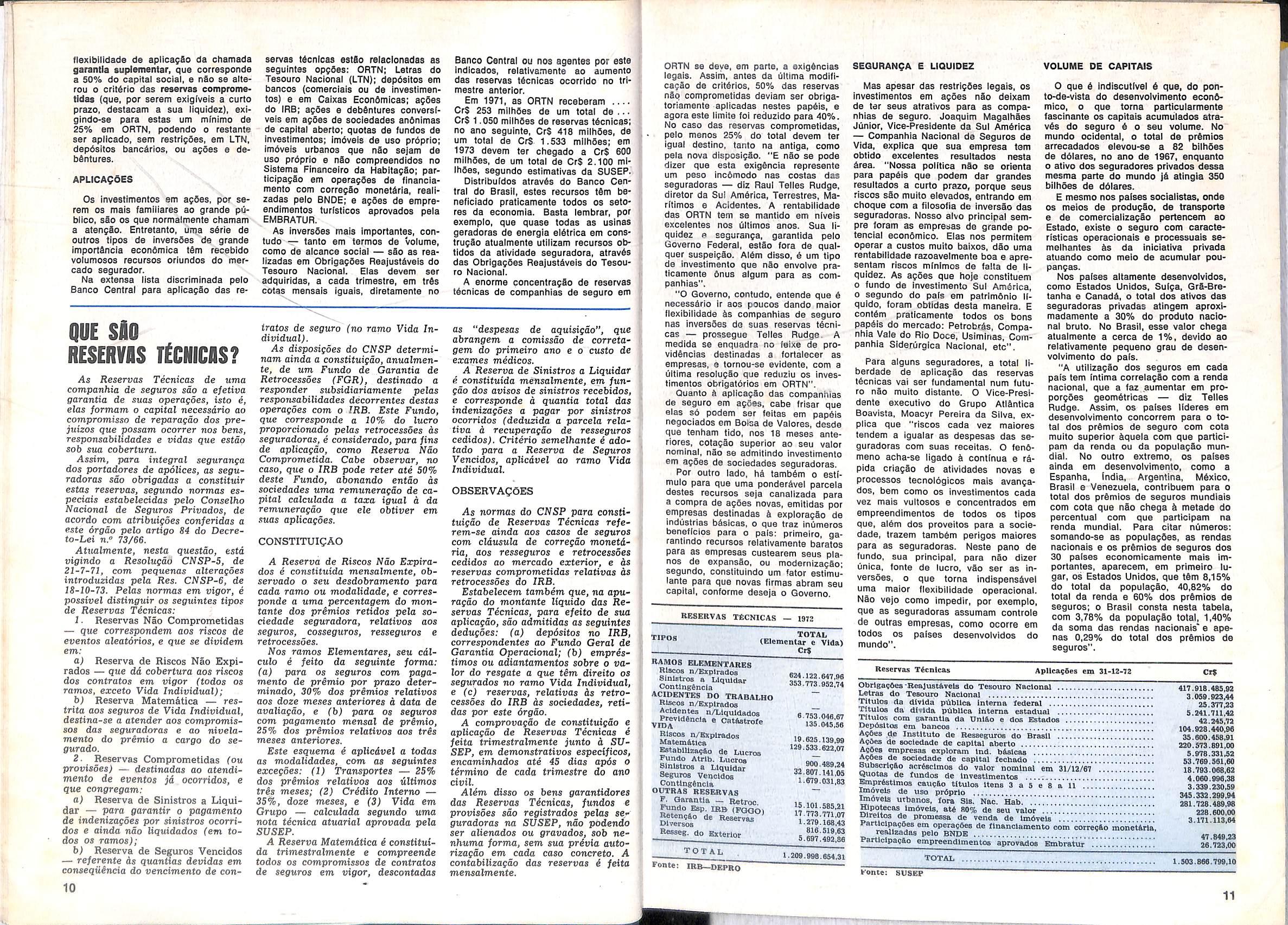 1969 para CrS 3.2 bilhoes em 1972, esperando-se que se situe entre Cr$ 4.5 a CrS 5 bilhoes em 1973. Os capitals sociais das seguradoras totalizam mais de CrS 1 bilhao, quando em 1970 somavam CrS 210 milhoes. A capacidade de investimento do mercado {patrimonio liquido e reservas tecnlcas do sistema, inciuindo o IRB) elevou-se de CrS 1,3 bilhao em 1970 para CrS 3,5 bilhoes em 1973. 0 lucro da atividade seguradora subiu do indice 100 em 1970 para 261 em 1972, com maior rentabilidade nas inversoes e superavits (antes inexistentes) na gestao de riscos. As inversoes do IRB em titulos publicos ou garantidos peio Governo Federal evoluiram de Cr$ 49,8 em 1969 para Cr$ 600 milhoes em 1973, colocandoo entre os maiores investidores nesses papeis. Nao obstante os elevados Indices de crescimento da economia nacional e do mercado de seguros, foi mantido baixo nivel de utilizagao do resseguro externo, registrando o Brasil a menor taxa do mundo (cerca de 3% da arrecadagao interns de premios). O capital social do IRB, de CrS 15 milhoes em 1970, passou a CrS 100 milhoes em 1973 e ascenderb a Cr$ 150 milhoes em principio de 1974. Muitos outros dados poderiam ser objeto de mengao, mas os indicadores aqui referidos bastam para oferecer expressiva sintese das transformagoes ocorridas no mercado segurador brasileiro e das que, sequencialmente, decerto resuitarao (a mbdio e longo prazos) da agao dos mecanismas de crescimento ja inqorporados, pelo sistema. " ' "!