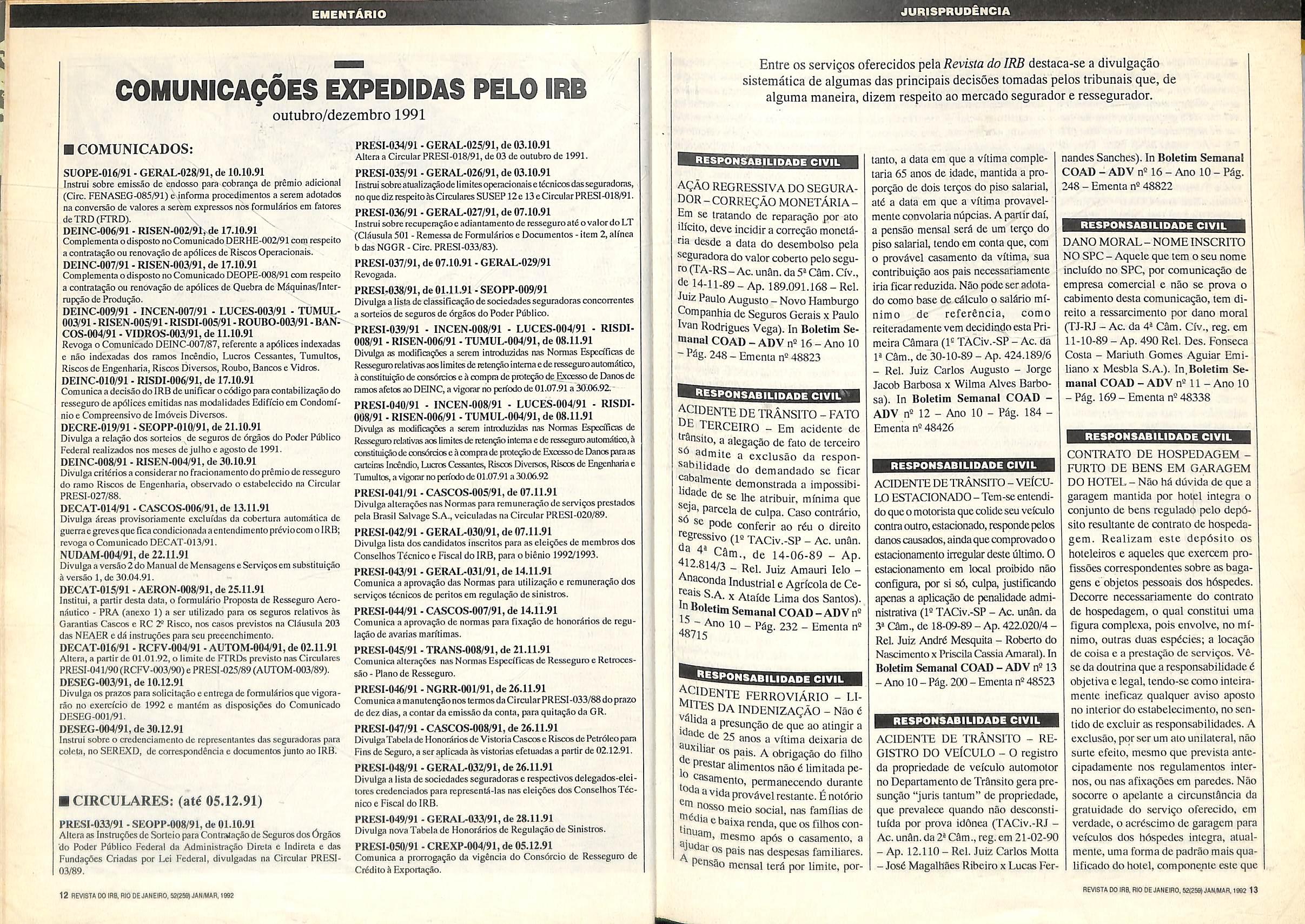Uma panoramica do lancamento do seguro de RC decorrente de Poluigao Ambiental ementArio Comunicados e Circuiares emitidos pelo IRB entre outubro e dezcmbro/91