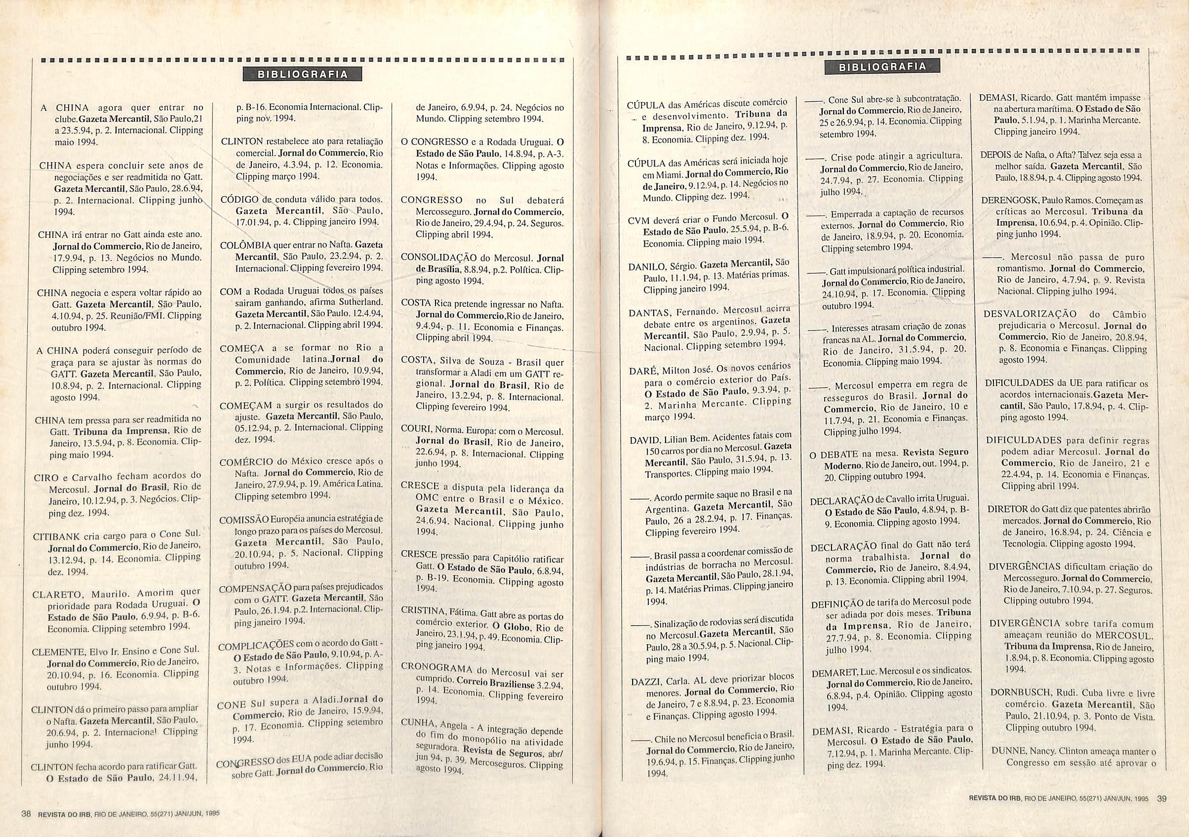 Alem dos habituais Ementdrio e Jurispriidenciay ainda hd para consultar duas bibliografias: a segunda parte daquela sobre Mercosuly origindriu do "clipping" didrio do IRB,e outra sobre Informdtica e Seguro, arrolando informaqoes selecionadas em vdrias publicaqdes nacionais e internacionais.