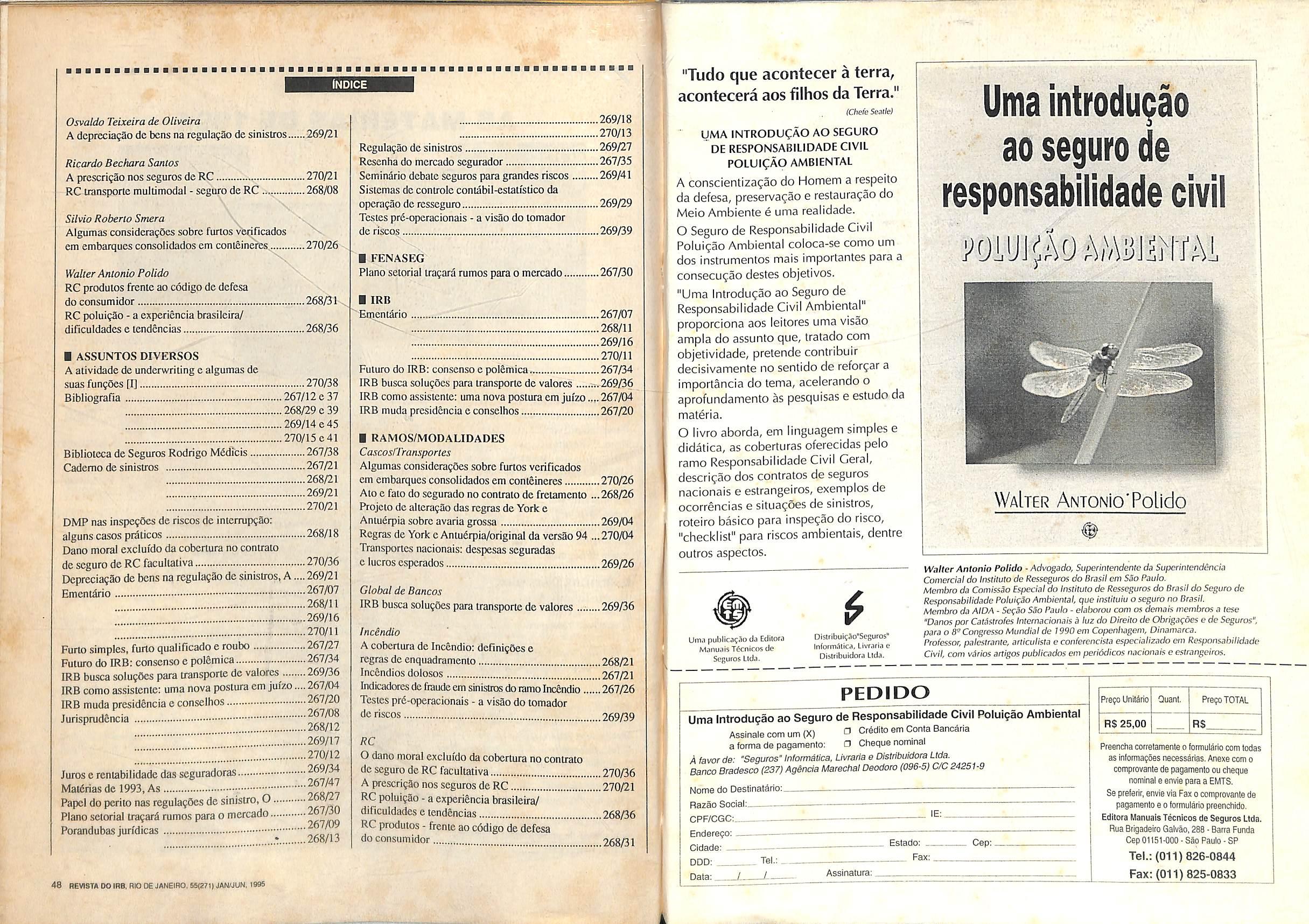 Walter Antonio Polido - Advogado, Supenntendentc da Supeciniendincia Comercial do insliiuto do Resseguros do Brasii em Sao Paulo. Membro da Comissao Especial do Inslituto de Resseguros do Brasii do Seguro de Responsabilidade PoluifSo Ambientai, que institiiiu o seguro no Brasii. Membra da AIDA - SefSo Sao Paulo - elaborou com os demais mcinbros a tese "Danes par Catostrofes Intcrnacionais a luz do Direiio de Obrigar^oes e de Seguros", para o B- Congresso Mundial de 7990 em Copen/iageni, Oinamarca. Professor, palesiranie, articuiisia e confercncisia especializado em Responsabilidade Civil, com Vilrios anigos publicados em periddicos nacionais e estrangeiros.
