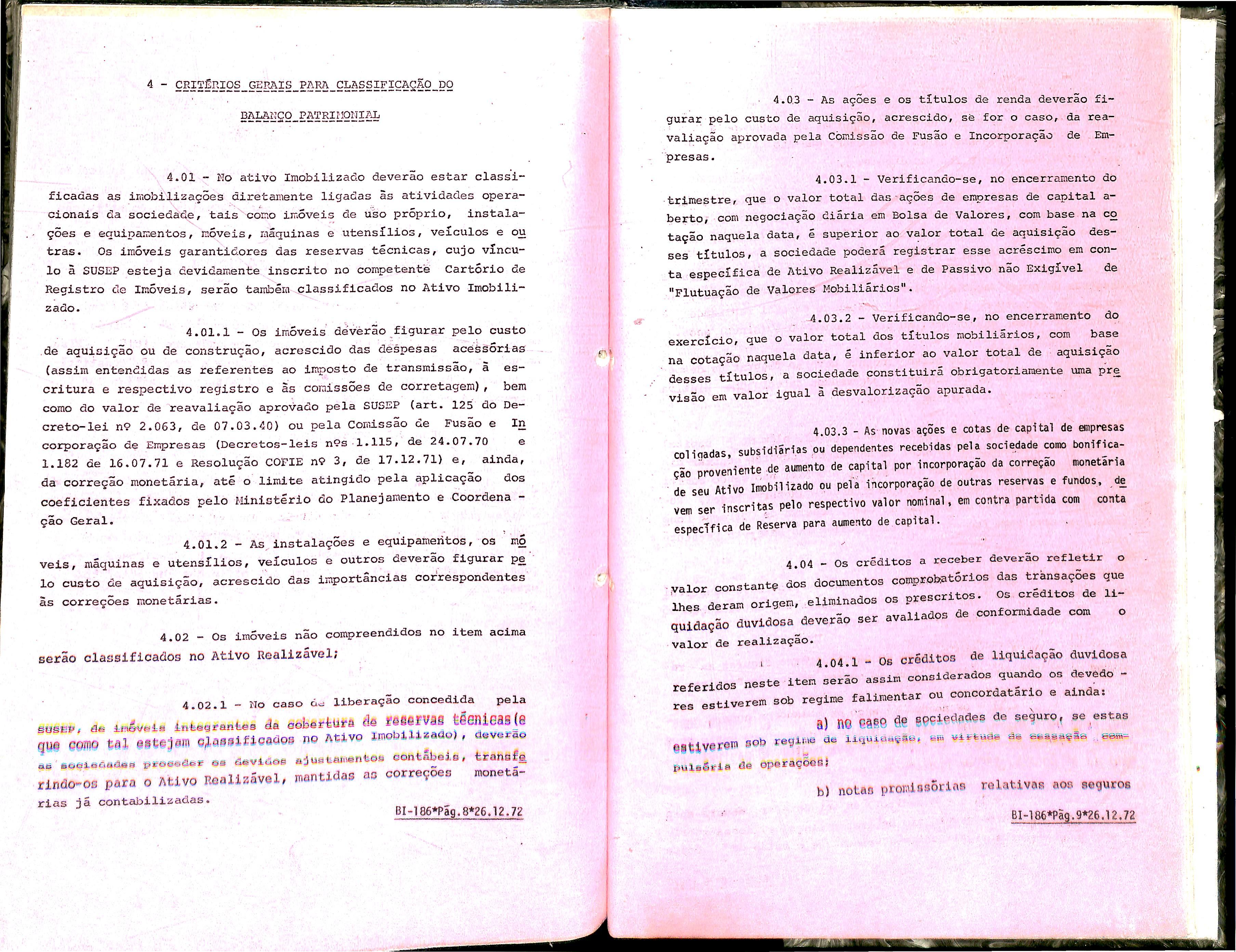 : entre os critêrios gerais de cl ass if·i cação do bal a:1 ço pet ri monia l, cabe. referir os aciotad0s pa ra a contabilização c!o at ivo iri:0bil i zado. i~est e fig urarão os i móve i s de uso prõprio, i nstalaçõ e s e equipamentos, mõveis, maqu ·i:-13.S e uterisilios, veicu1 os e o~ tras imobilizações, alem dos imõveis garan t i dores de reservas te~ 11icas, cujo vincu1o ã SUSEP esteja devidamente inscrito :io competente Cartori o de Registro de Imõveis. Quaisquer out r os imó ve is, como os r~ ~reseitativos de aplic a ções de reserva s l ivr es, s e rã o classificados m At iv o Realizável, não pode?1do ser cor rígÍJOS mo:-i et arian~nte.