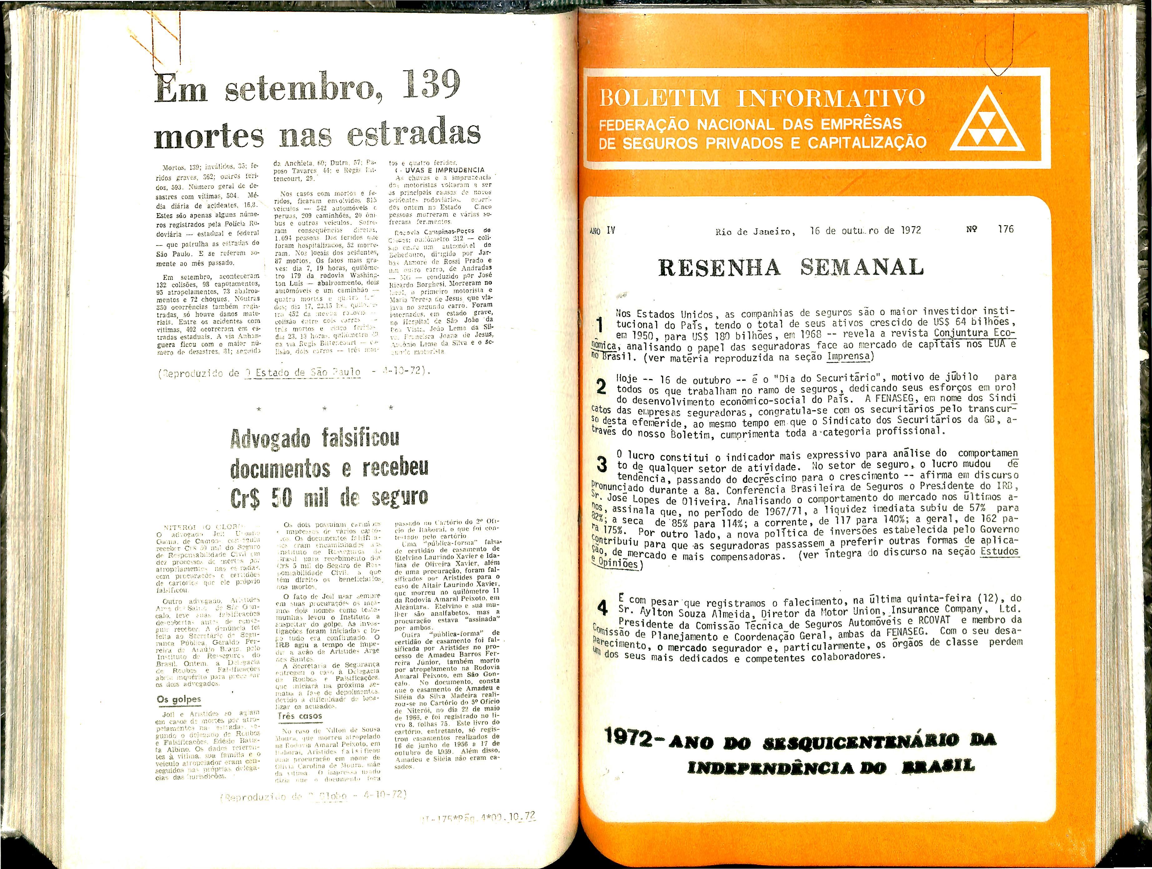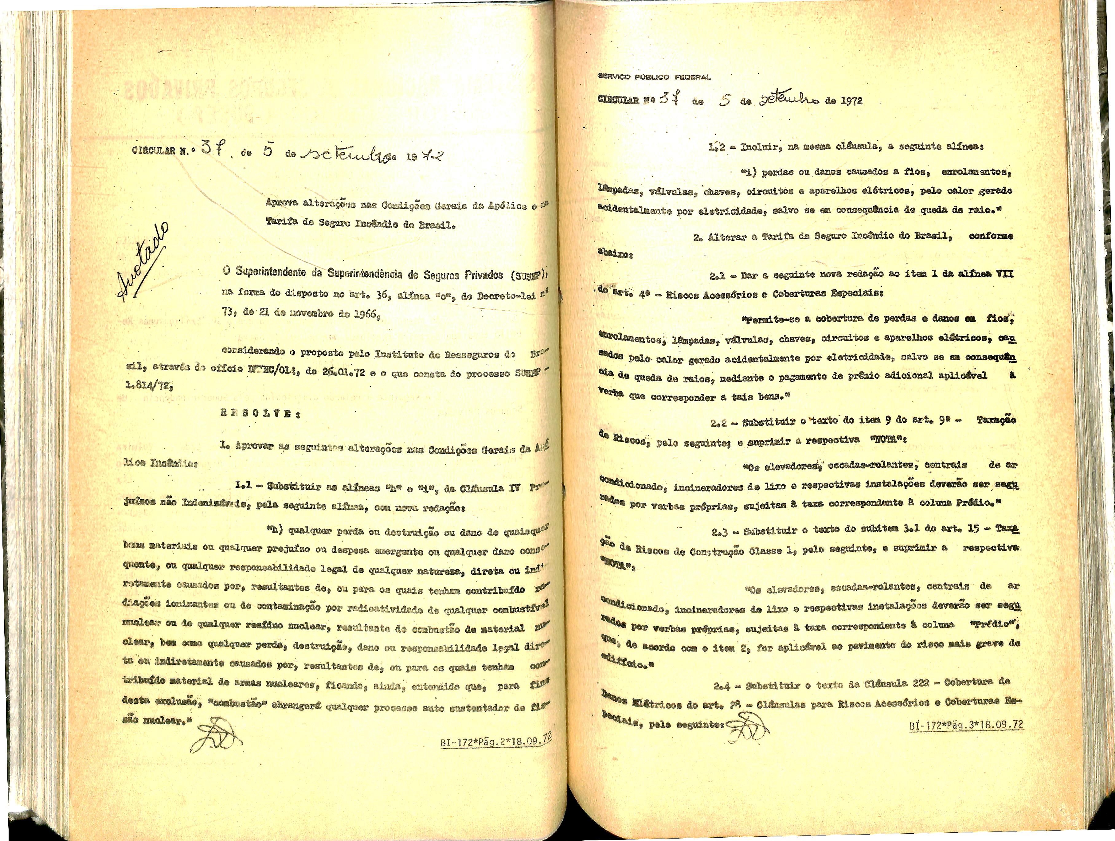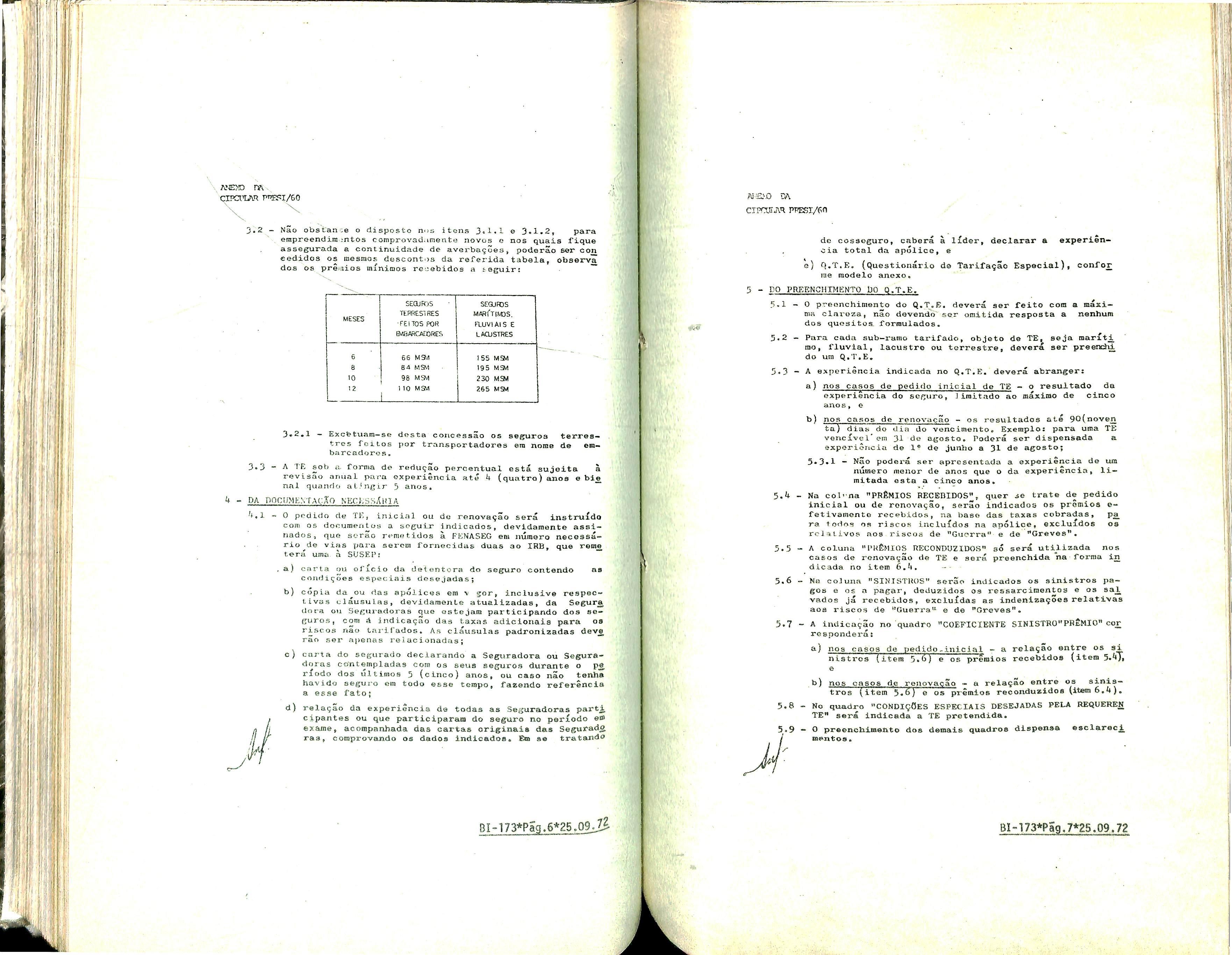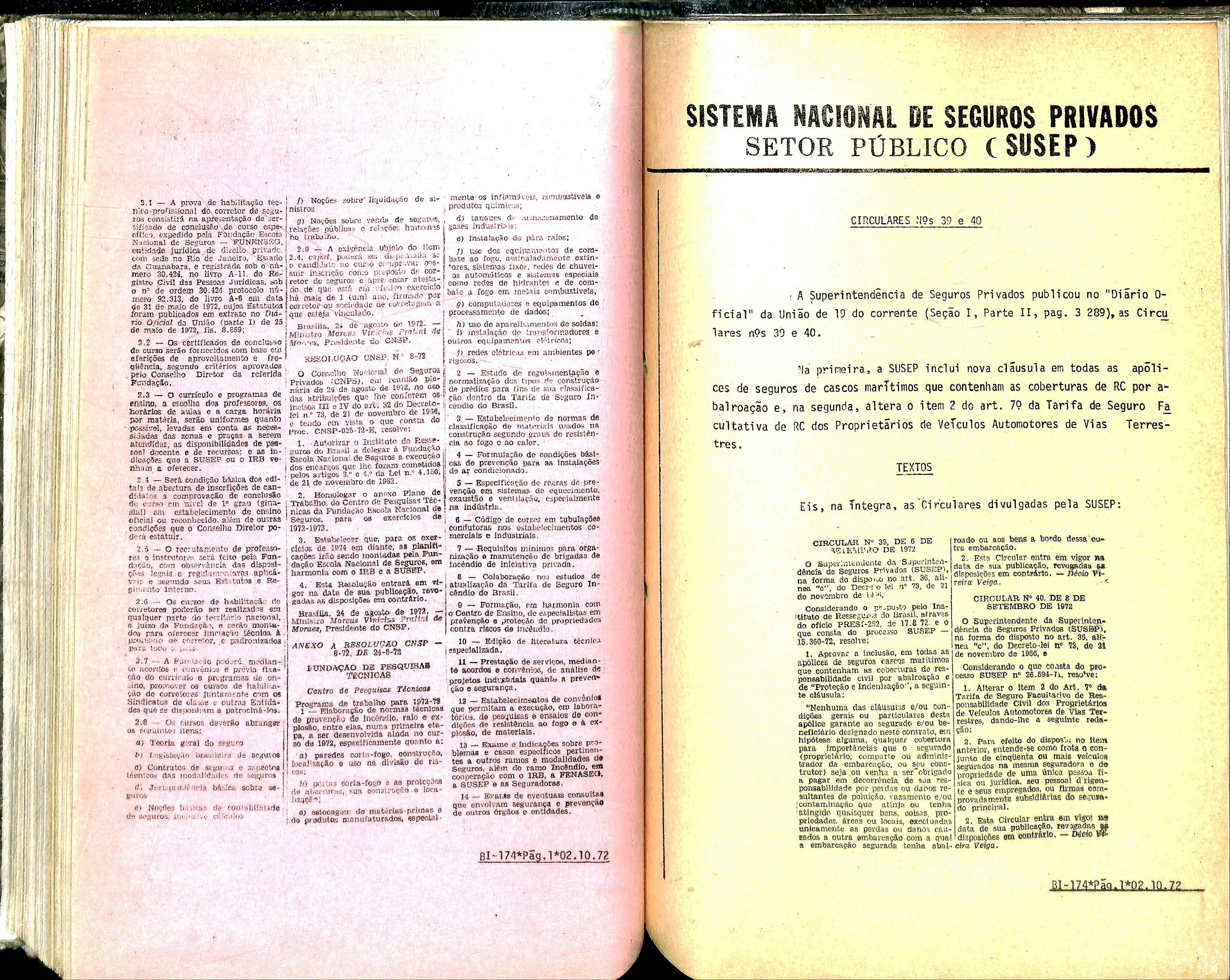 O "Diãrio Oficial" da Uniâo de20 de junho (Seção I, Parte_II, pâgs. 2 360/69) publicou a Circular n9 -l9-{9-2-72), da Superintendencia de Seguros Privados, que aprova Tarifa, Condições Gerais e ·Especiais de AQÕli_ cedo Ramo Roubo. No mesmo ôrgão de 23 de junho (Seção I, Parte II, pags. 2 413/14), foi publicada a Circular nQ 33, da SUSEP, que altera a Tarifa de Se guros Automóveis - Art. 11, acessórios e equipamentos e Clãusula nQ 4, cobertu-=ra adicional para acessõrios e equipamentos.