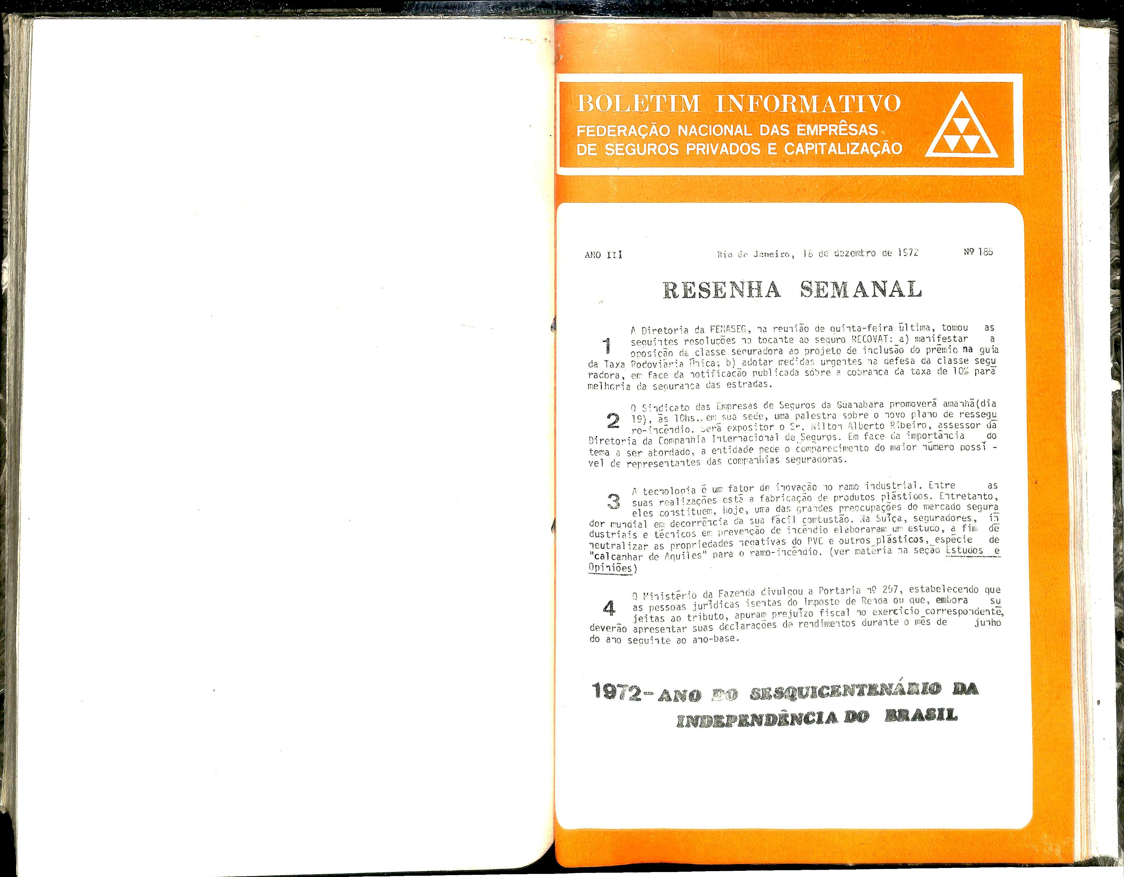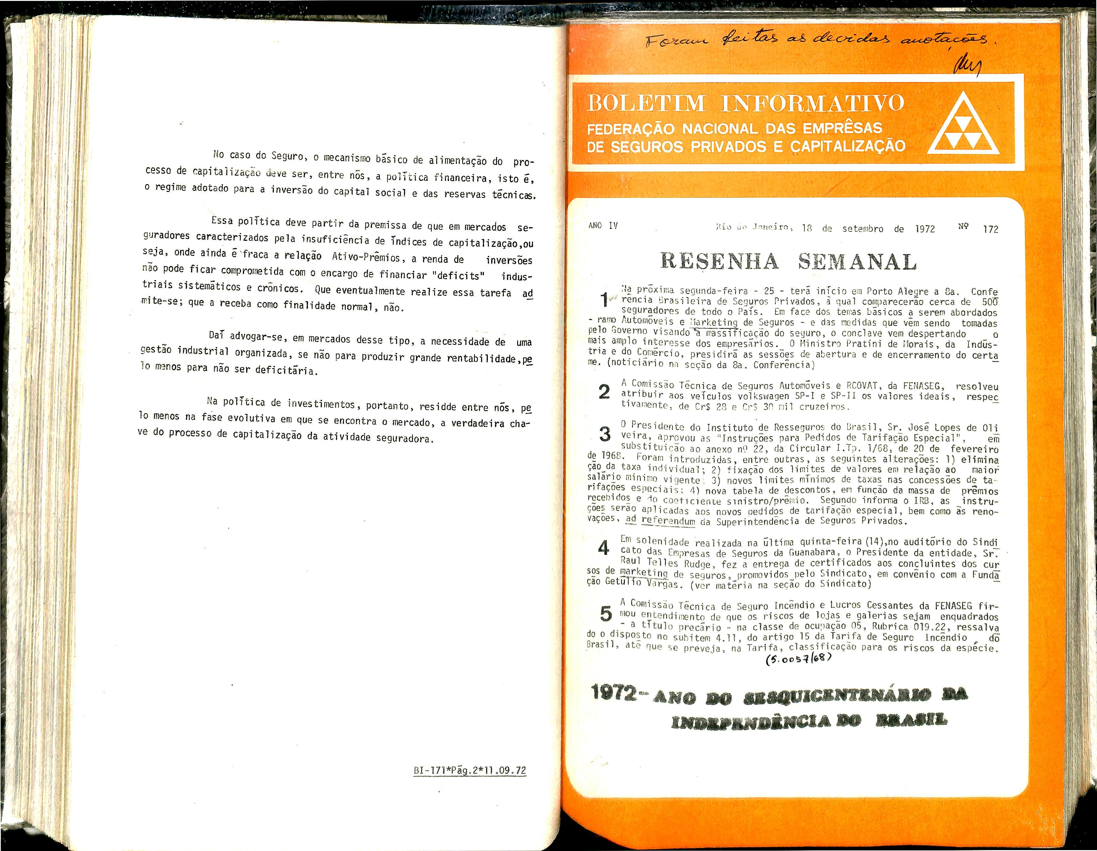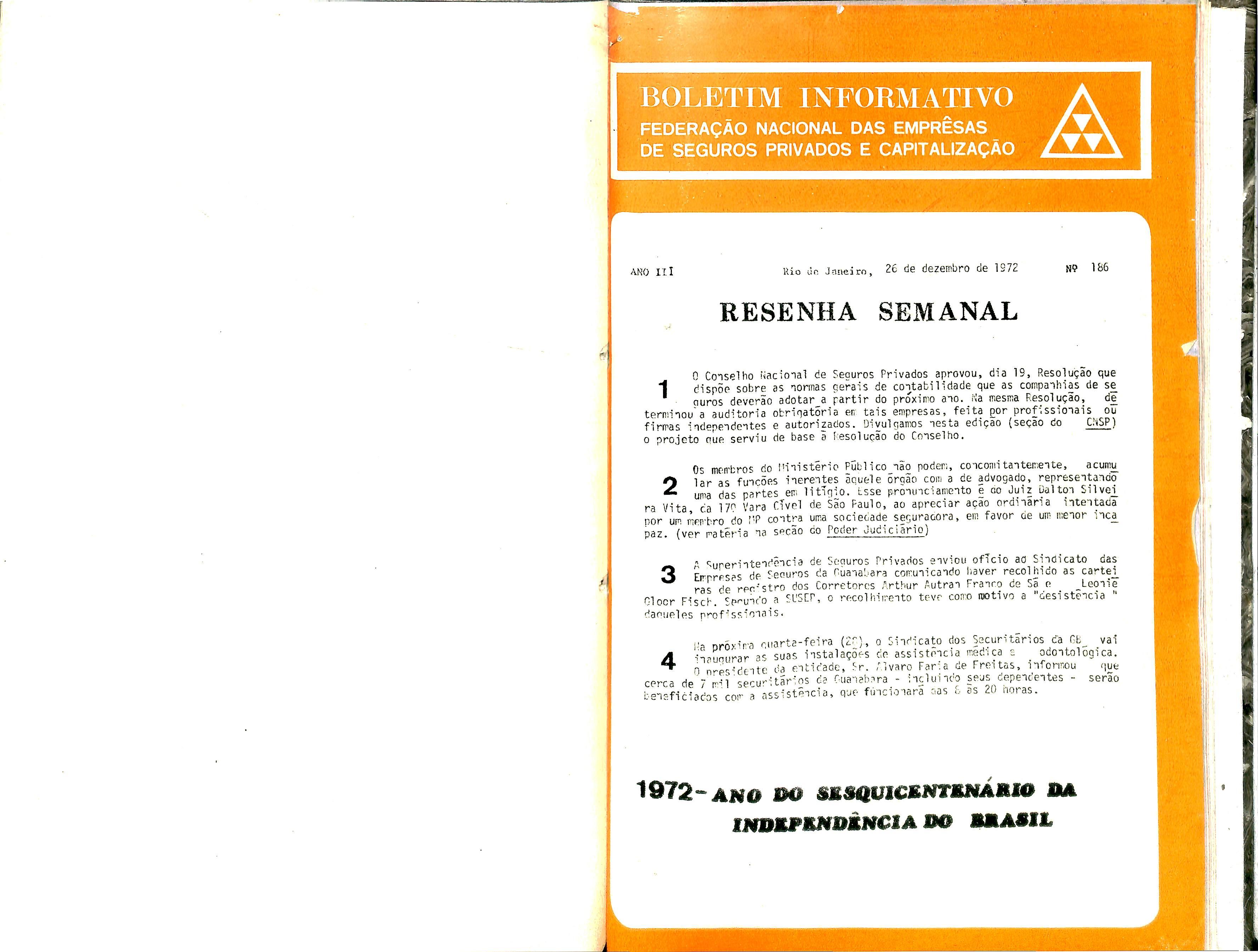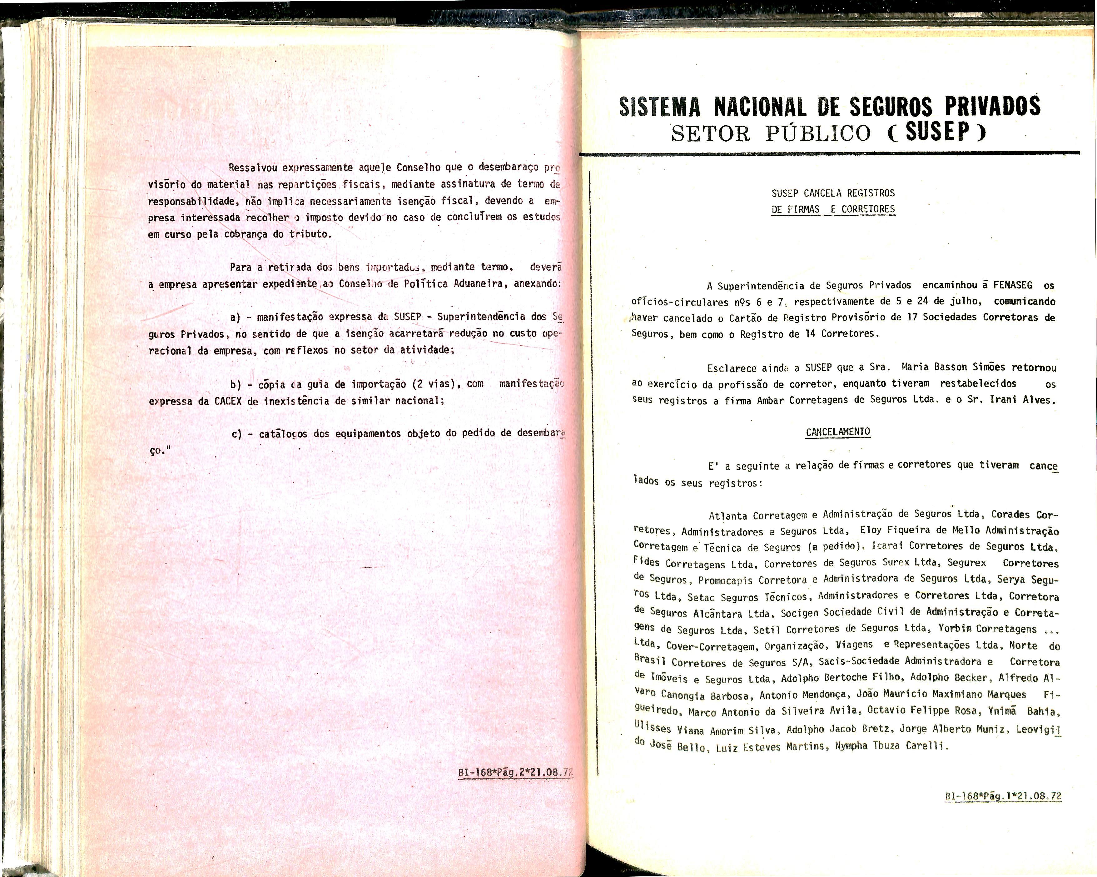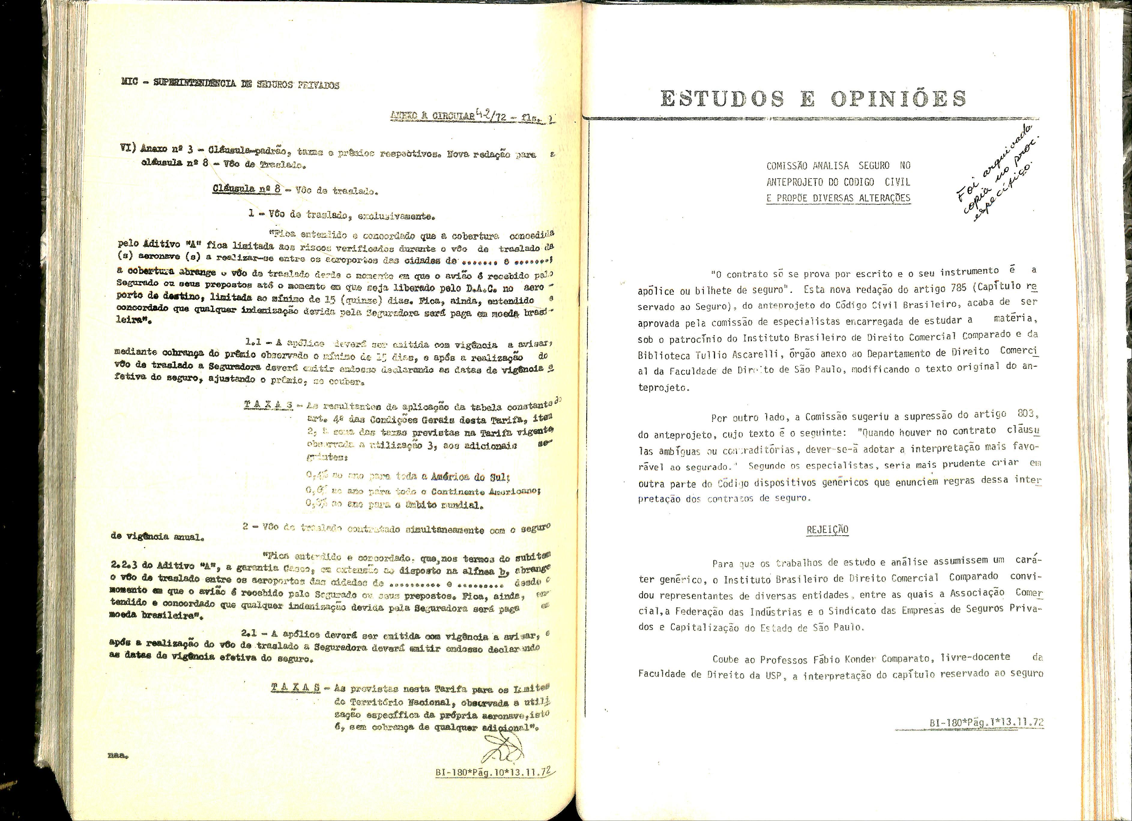 O "Diãrio Oficial" da Uniâo de20 de junho (Seção I, Parte_II, pâgs. 2 360/69) publicou a Circular n9 -l9-{9-2-72), da Superintendencia de Seguros Privados, que aprova Tarifa, Condições Gerais e ·Especiais de AQÕli_ cedo Ramo Roubo. No mesmo ôrgão de 23 de junho (Seção I, Parte II, pags. 2 413/14), foi publicada a Circular nQ 33, da SUSEP, que altera a Tarifa de Se guros Automóveis - Art. 11, acessórios e equipamentos e Clãusula nQ 4, cobertu-=ra adicional para acessõrios e equipamentos.