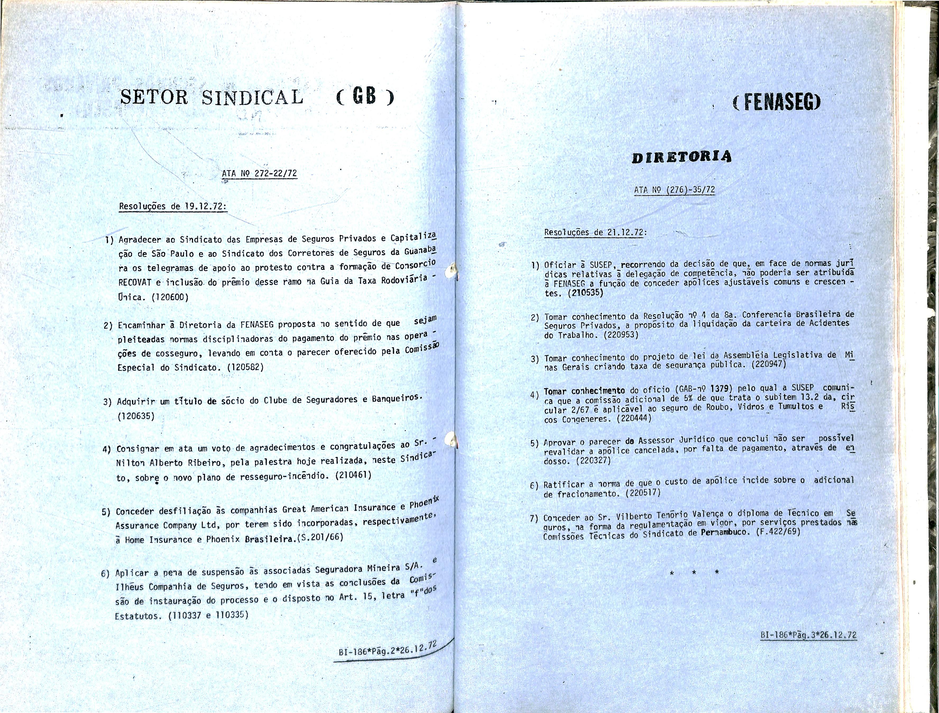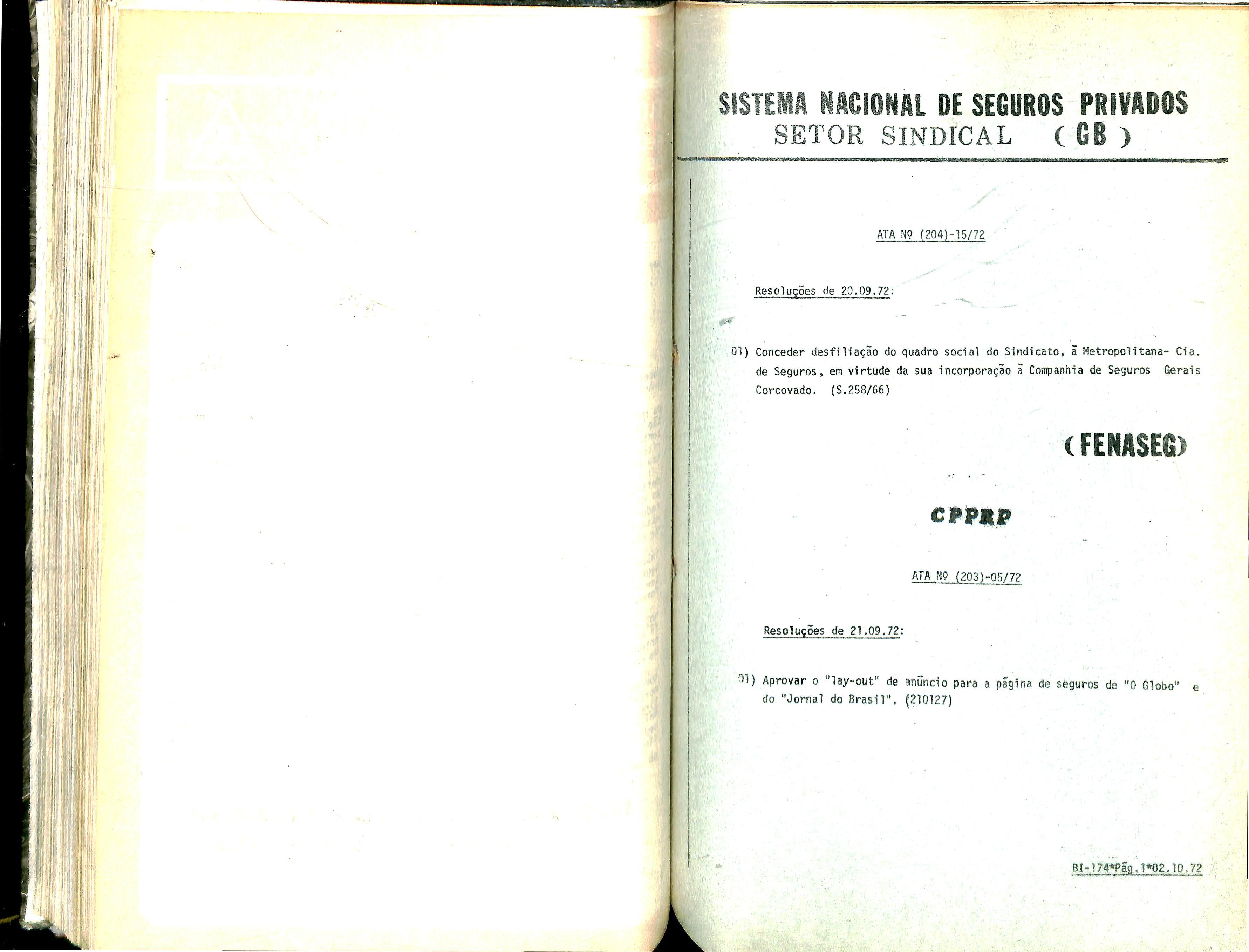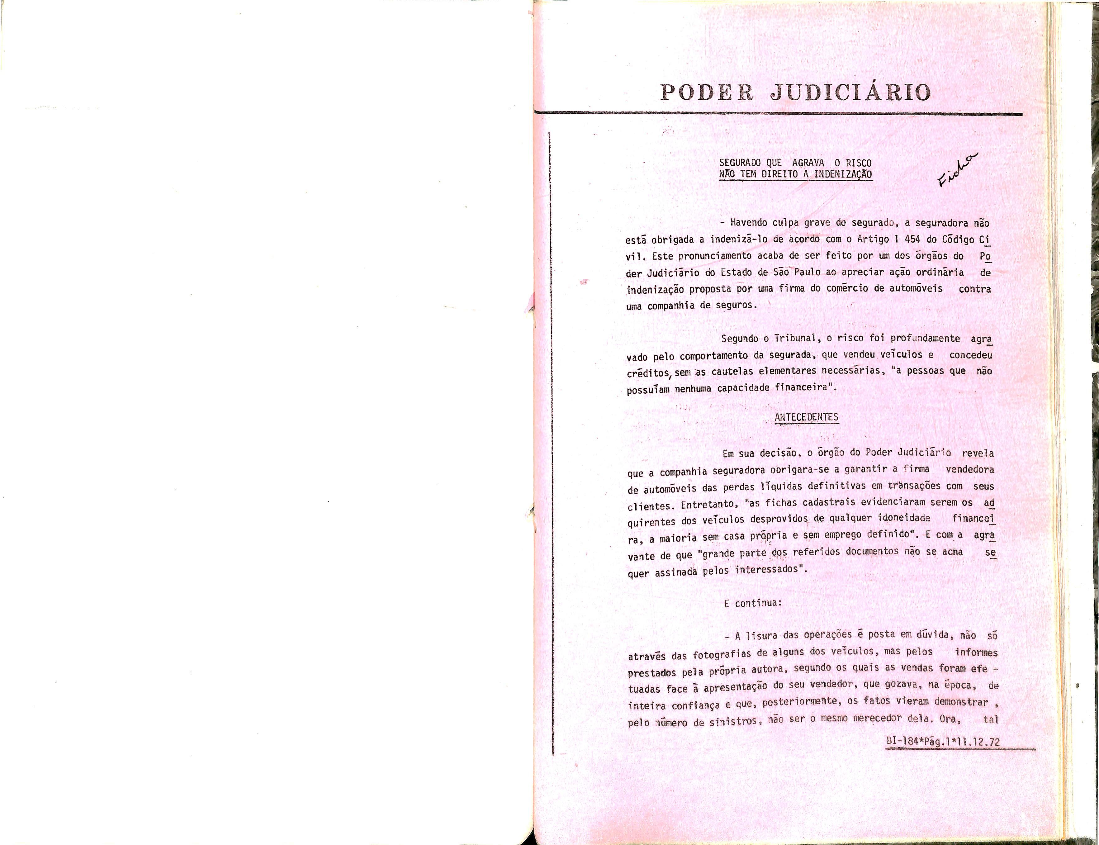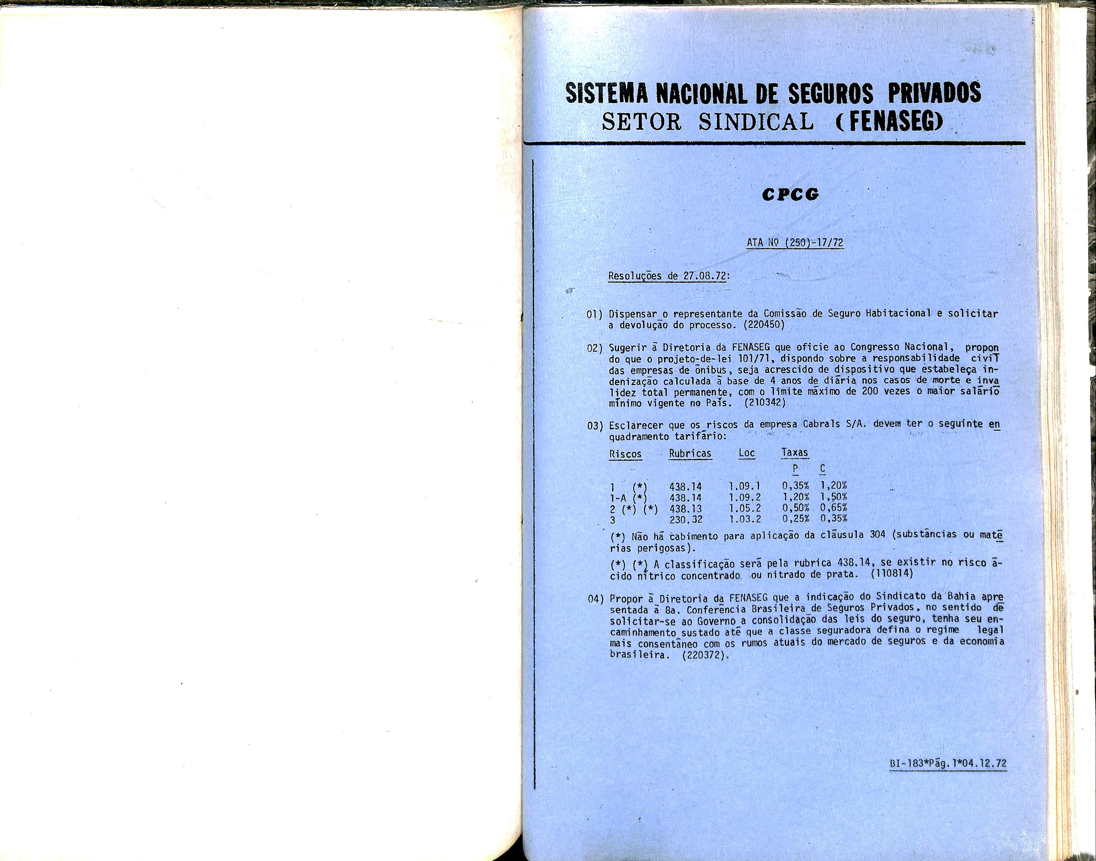 O "Diãrio Oficial" da Uniâo de20 de junho (Seção I, Parte_II, pâgs. 2 360/69) publicou a Circular n9 -l9-{9-2-72), da Superintendencia de Seguros Privados, que aprova Tarifa, Condições Gerais e ·Especiais de AQÕli_ cedo Ramo Roubo. No mesmo ôrgão de 23 de junho (Seção I, Parte II, pags. 2 413/14), foi publicada a Circular nQ 33, da SUSEP, que altera a Tarifa de Se guros Automóveis - Art. 11, acessórios e equipamentos e Clãusula nQ 4, cobertu-=ra adicional para acessõrios e equipamentos.
