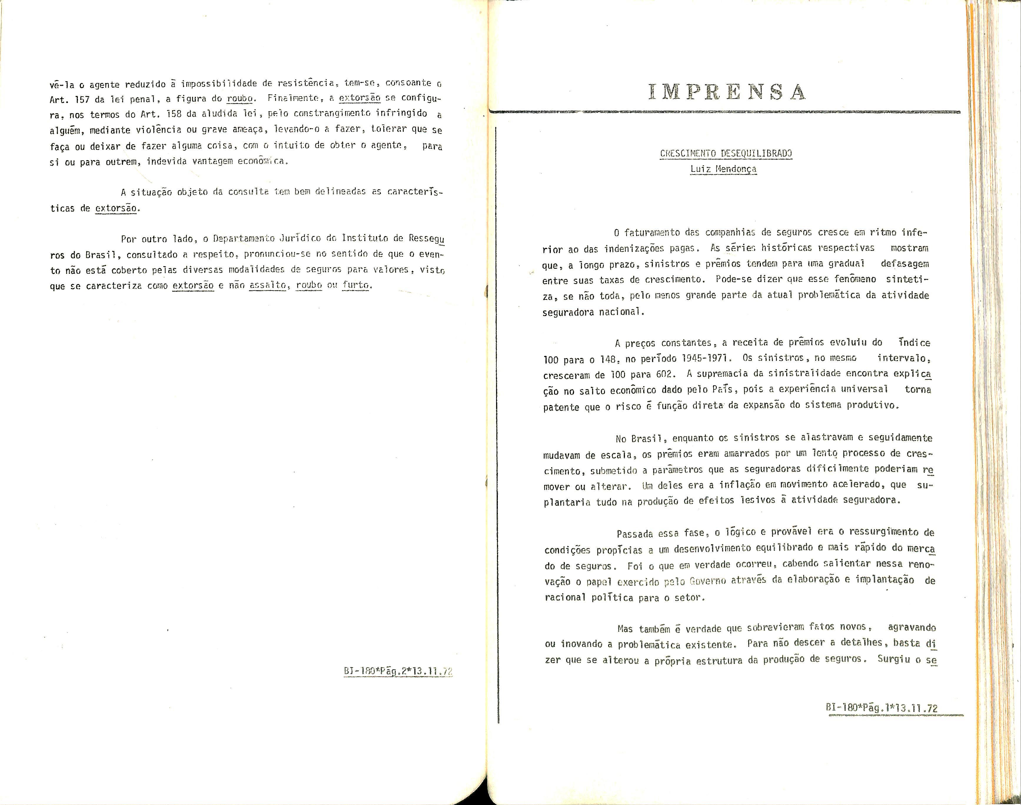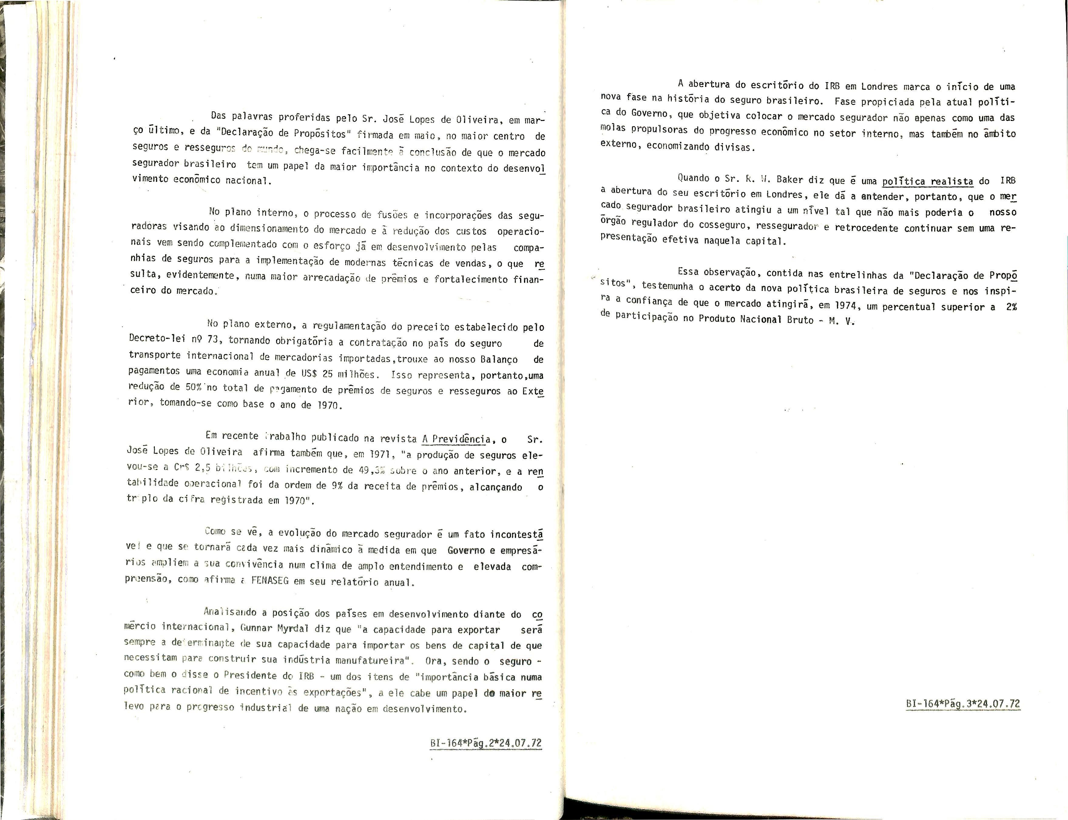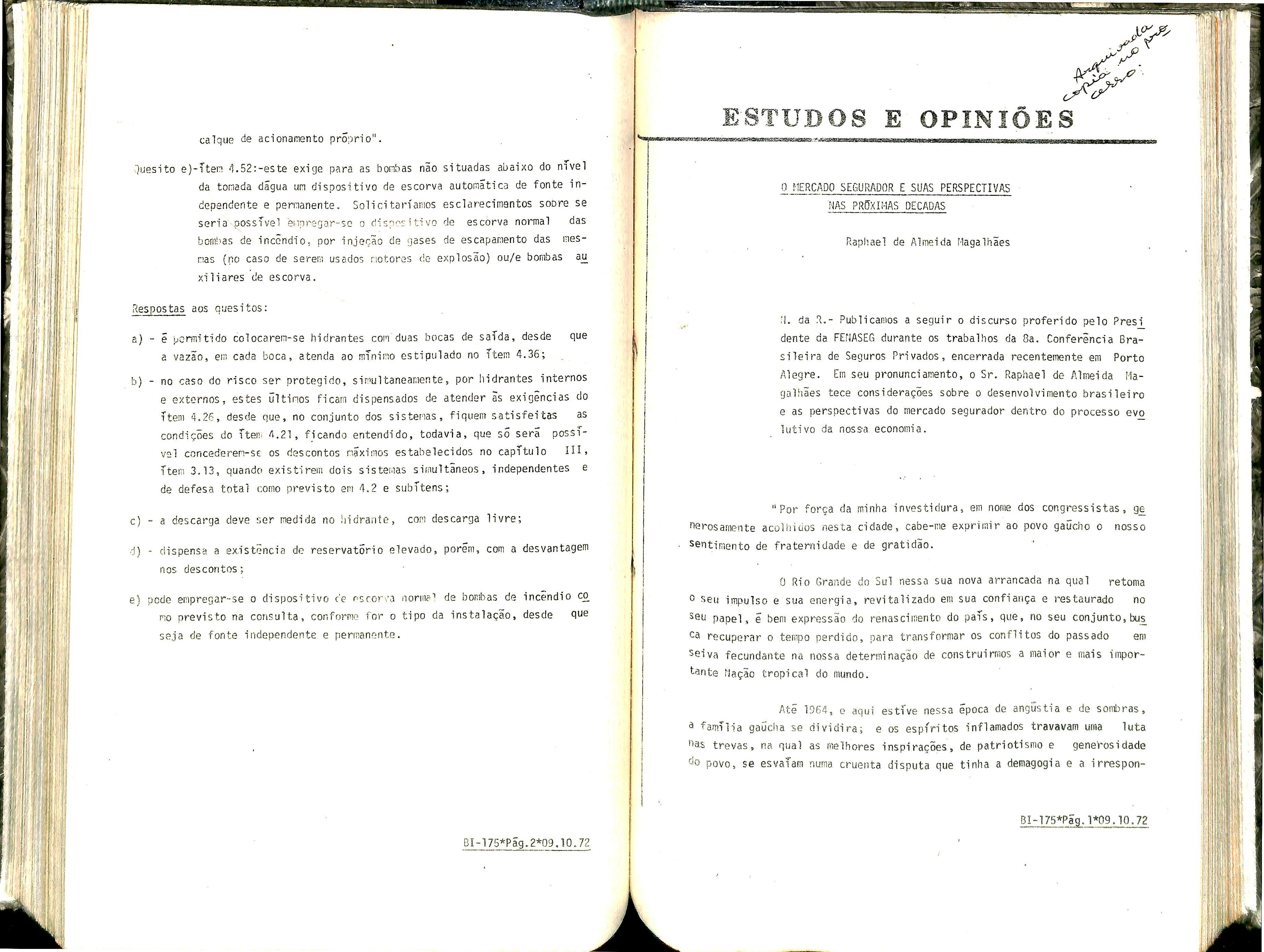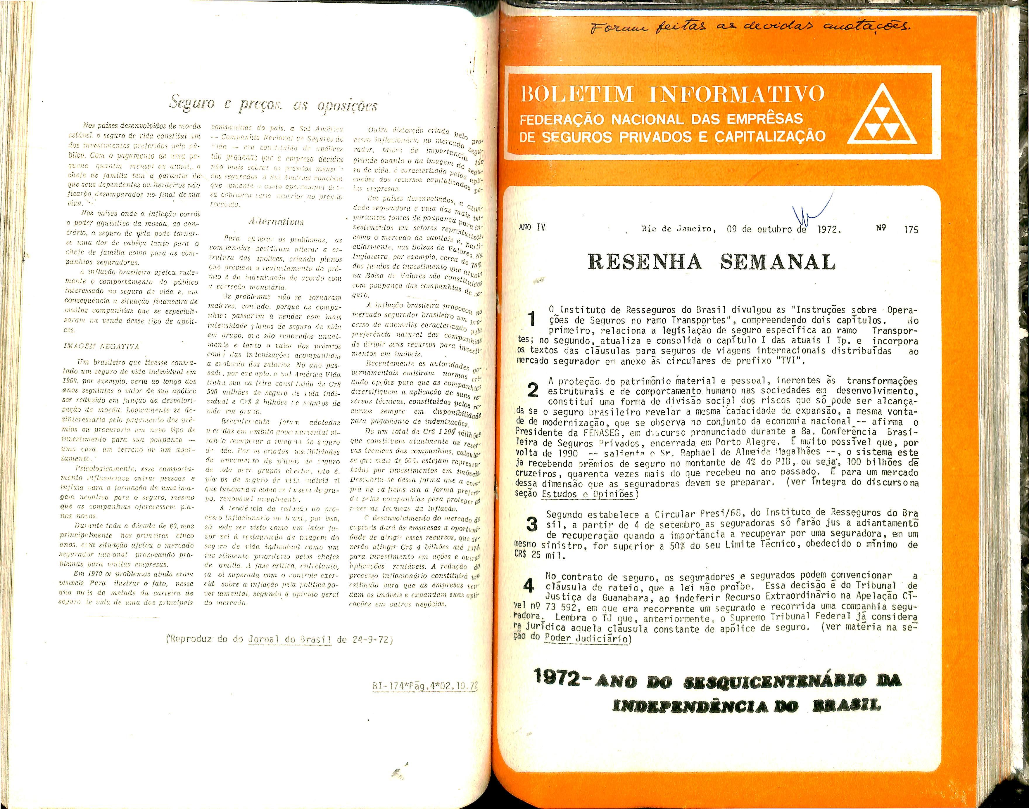 A tese, convert ida em principio le gal, foi então amplamente fu ndament ad a em todos os aspectos: jurídico, econôm i co, financeiro e técnico . O In~ tituto de Resseguros do Brasil (IRB) , em face de reações isoladas que se _registraram em alguns pa1ses , chegou a editar monografia bi l in gue, explicando e justificando de forma exaustiva a medida brasileira .
