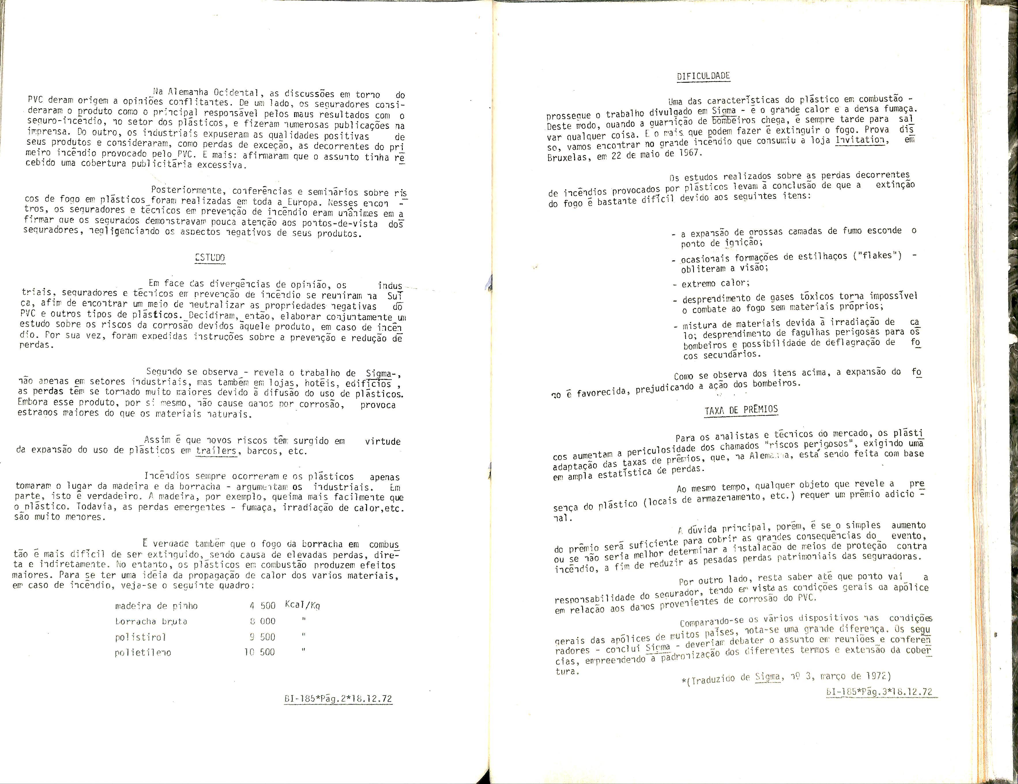 Ora, quanto ao primeiro fator, em resumo a e xperi~ncia ven1 mostrando que, entra suas classes, hi uma certa proporcionalidade de riscos, sobretudo relativa às consequências destes~ porque, se em localida des abrangidas nas melhores classes d e Localizaçio, h~ mais Recursos de Combate a Incêndio, existem também mais e maiores concentrações de valores com as decorrentes elevaç~es nos resultado s dos danos de sinistros. O contrário ocorre nas c idades reunidas nas piores classes de Localização em que , se há menos Recursos de Combate a Incêndio, exis t em menos e menorss concentraç3es de valores. E ainda assim esses Recursos de Combate a Incêndio são de resuJ.tados contraditórios, haja vista a ocorrência desses sinistros no centro de grandes metrópoles que acabam por se propagar a t~ do um edifício, c l assificado na melhor das classes de Construção. Muitas as explicações para esses fatos mas o que conta, para o Seguro, é que eles ocorrem e seus danos alevadissimos. Mas basta l e mbrar que já é da própria natureza desse evento sua 11 Eclosão 11 e "Incubação" discretas,geral_ mer.te despercebidas, principalment e verifi c ado ho~a s mortas, propriciando alarm e e c ombat e ta rdios.