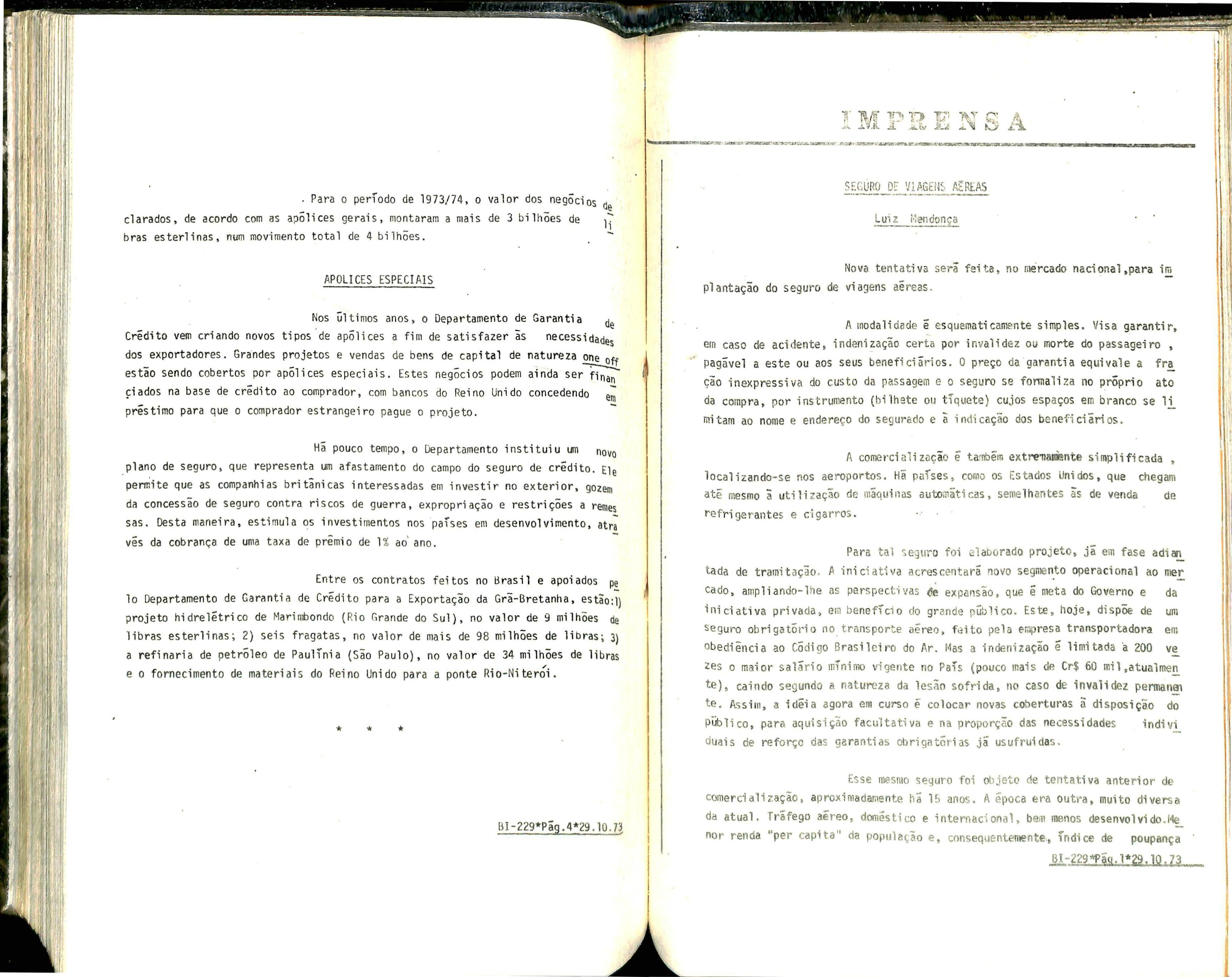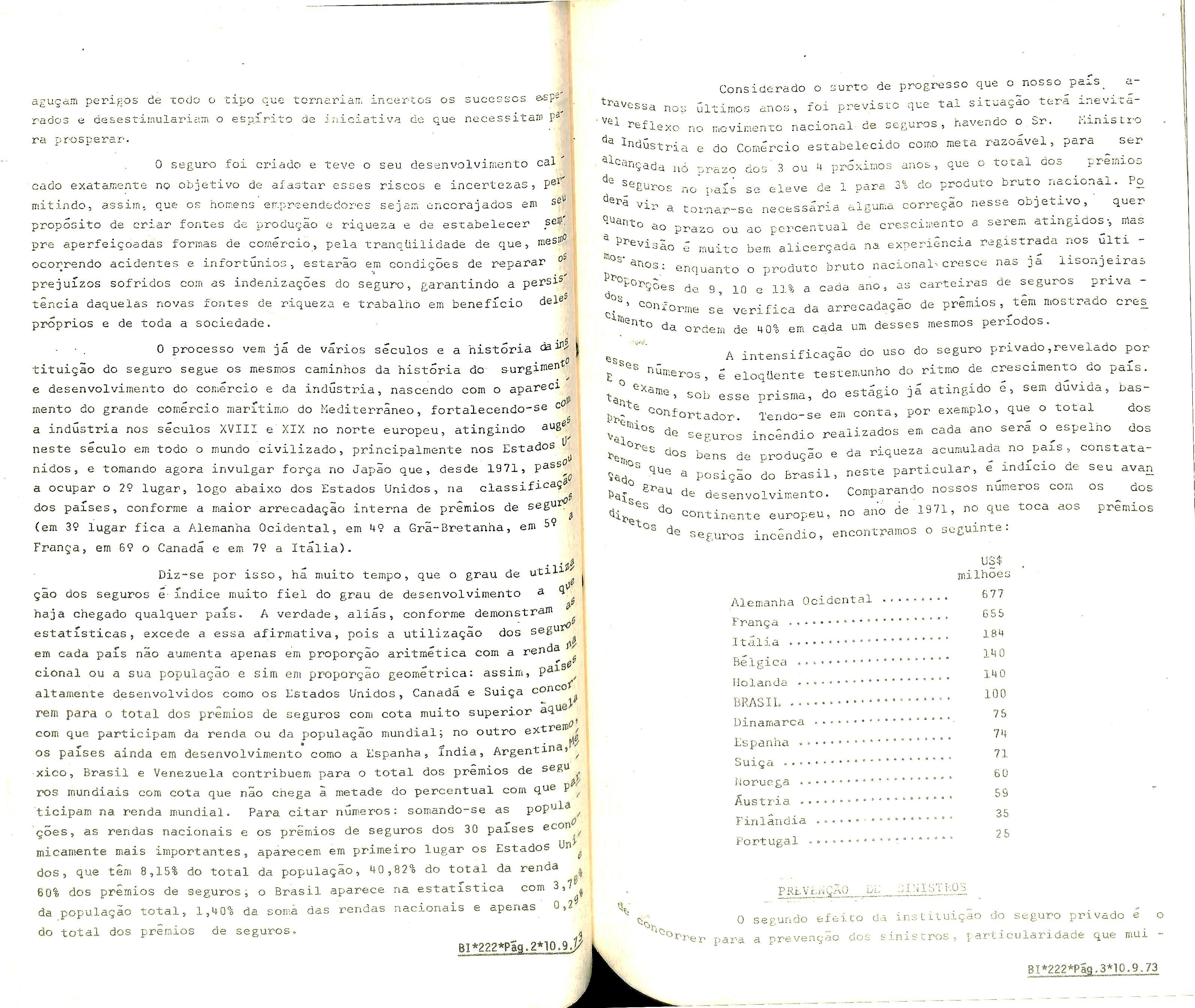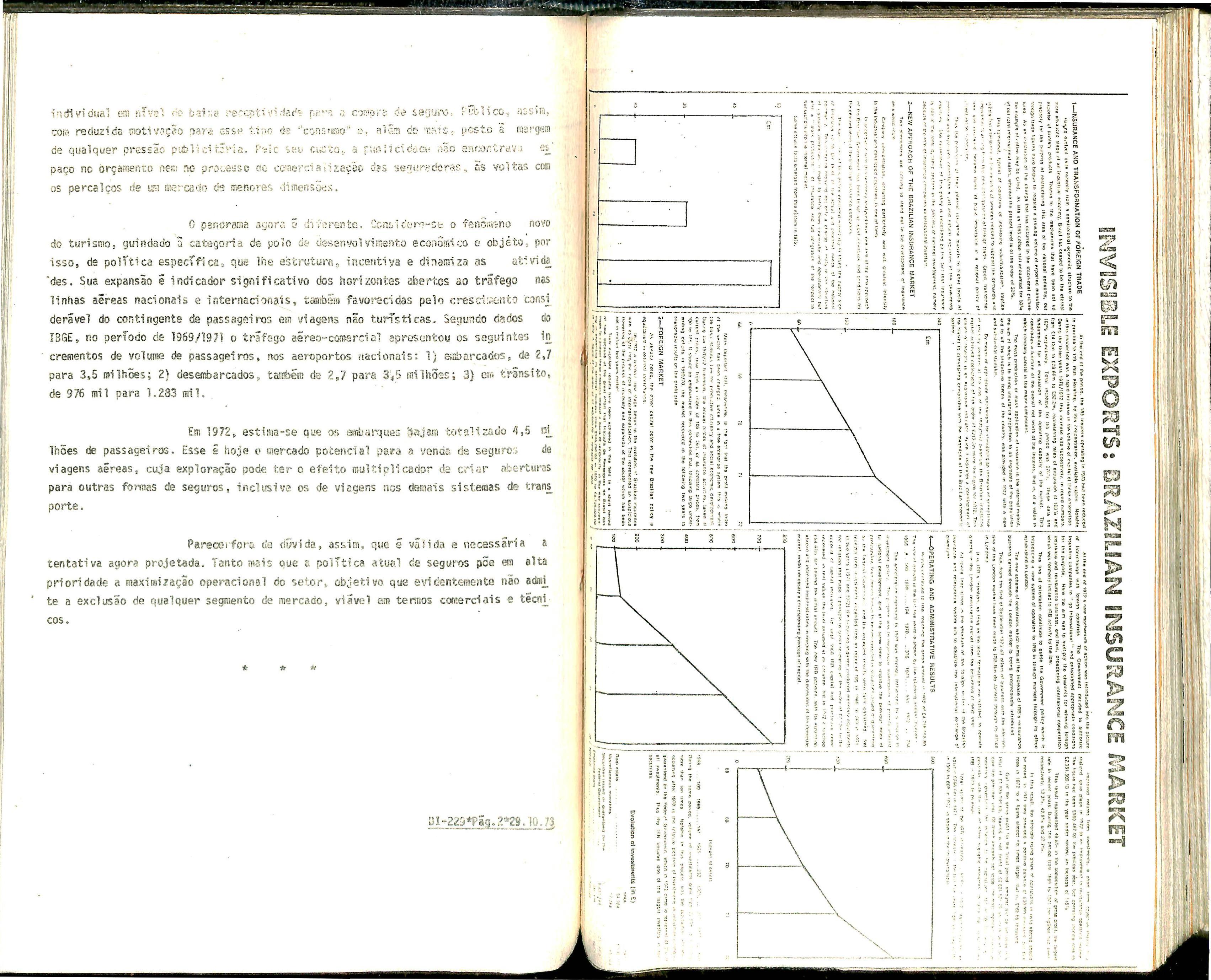 Ajus tacla s ·pe , os 1!11m c,~s ger,r1s e preç0>, ?S resE r vas. tec nicas. o me r ca do segurãd o r b r asiieiro evo·l ui ra rri de 66 4 rrilh ões de cruzeiros err. 191l5 para .• 899 milhões em 1971. revelan d0 cresc im e nt o 1eal da ordem de 35 %. Mas acontp r~ q ue) no me smo perío do , exp an s ão muHo mai :, rãp id a se ob s ervou na arrecadação de p re mios t que deu um sal te de 547 mi1hÕes pa r a 2 ~4 bilhões, cres cenci o 338¾