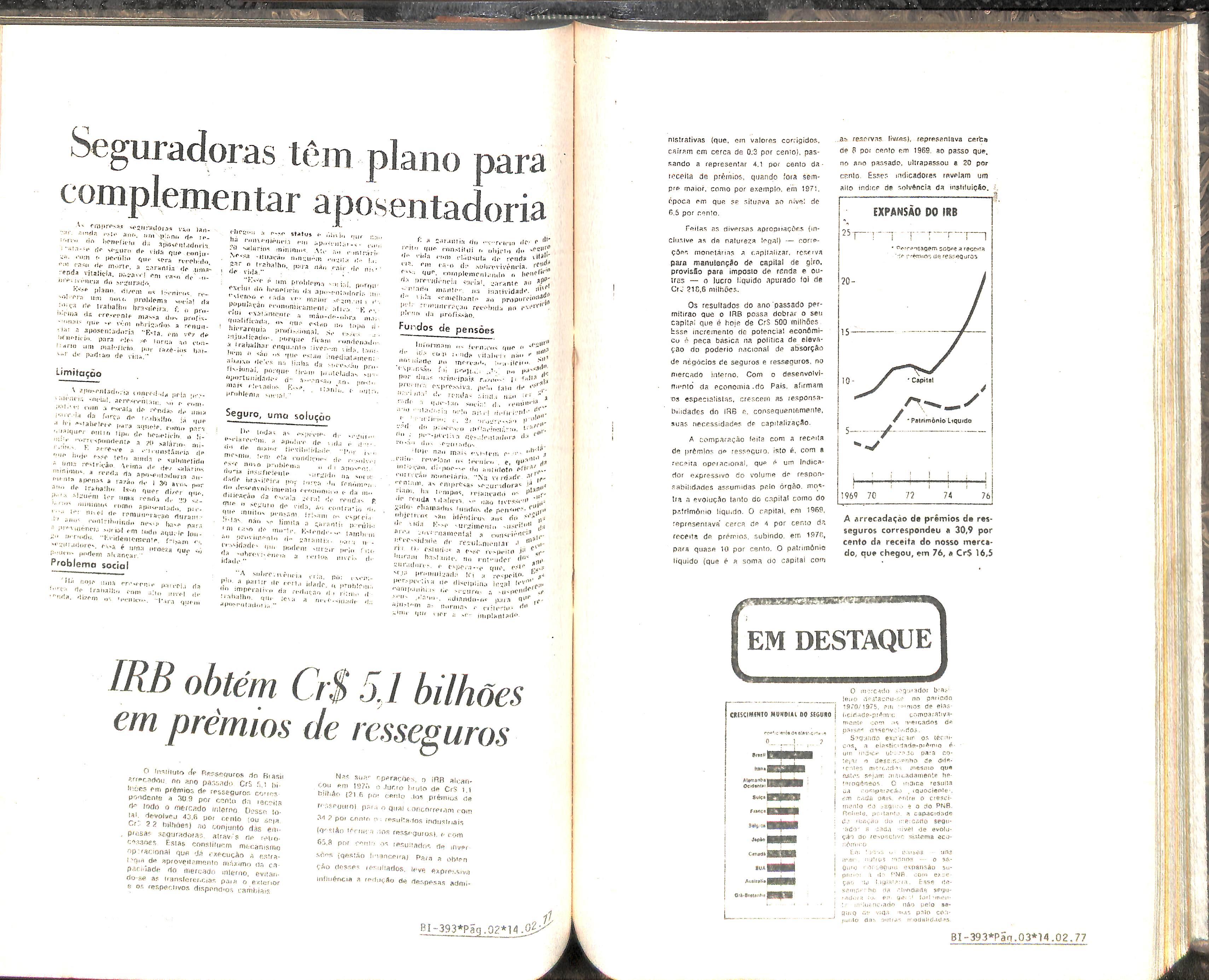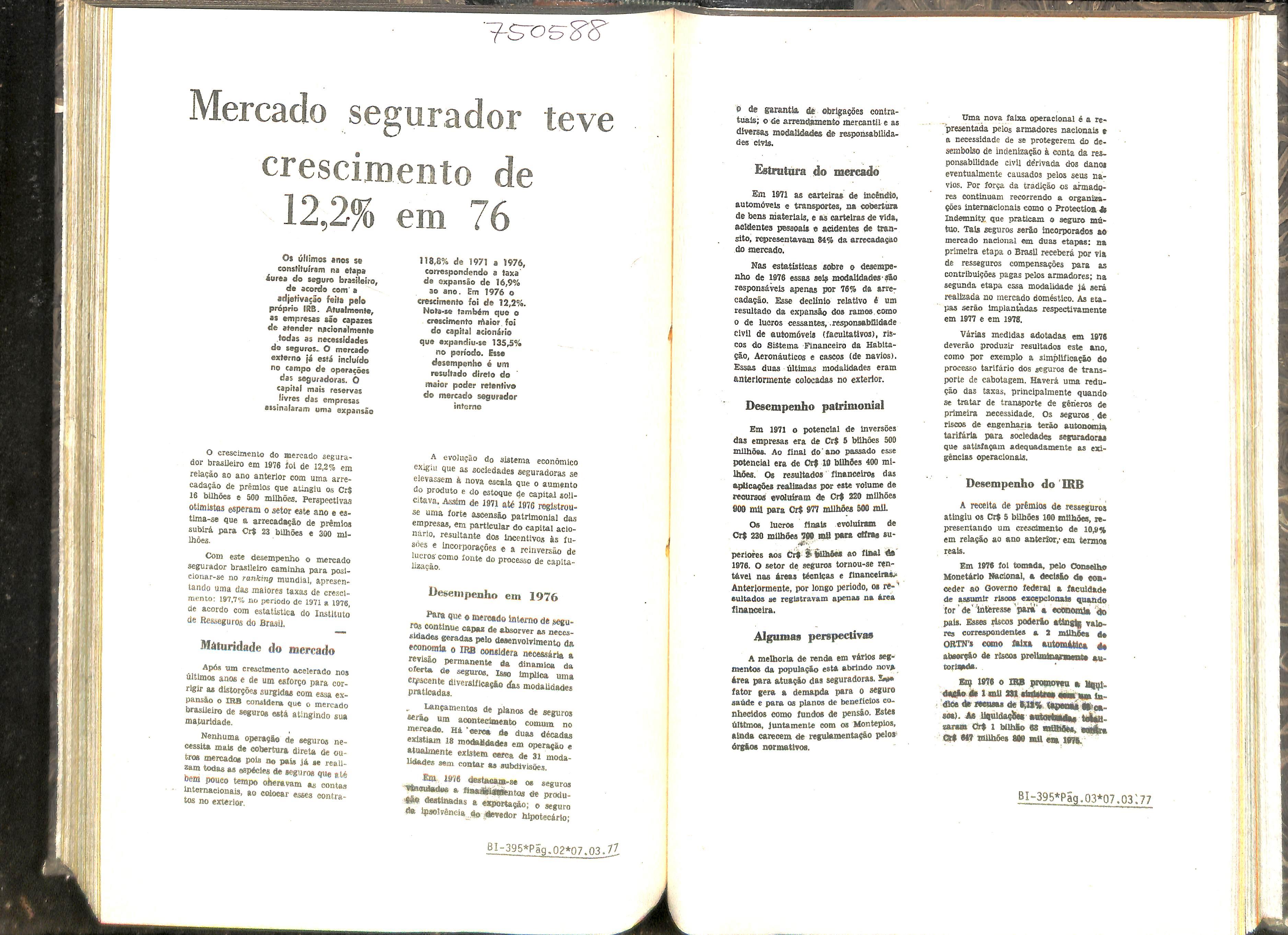 Os , prêni.os de seguro arrecadados no ~iodo jal'leinV setart:lro de 1976, no Jt"Ontante de Cr$ 11.416. 715.646, 14, acusam o incremanto, em reJaçãO ao rnes_ no perlodo do an::> anterior, de 59,30%.