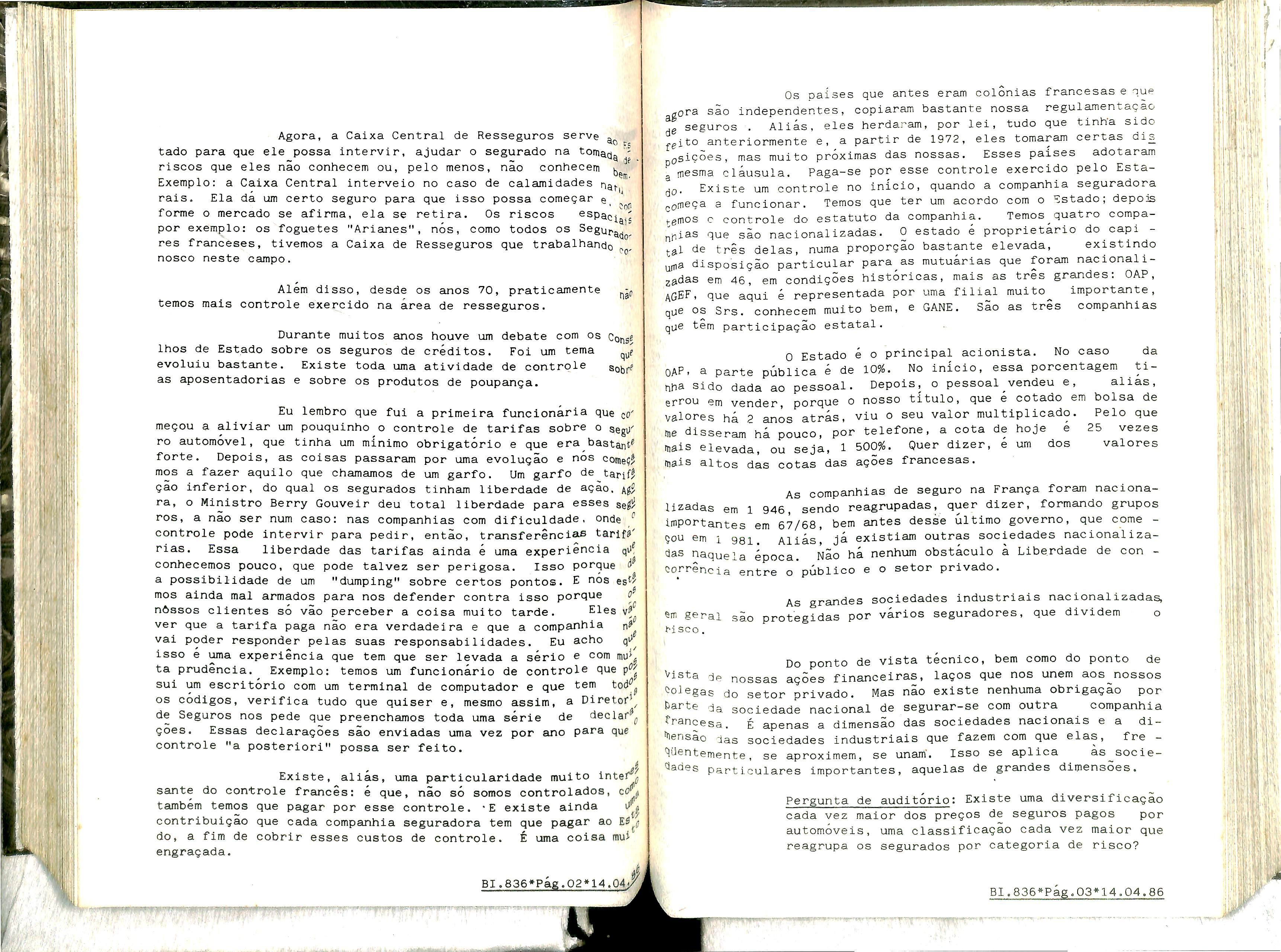 Dia 20 de dezembro, o Sr. Jorge Hilário Gouvêa Vieira foi ho menageado pela seção brasileira da Associação Internacional de Direito do Seguro-Aida. Na oportunidade, afirmou que "O IRB não registrou em gualquer ano resultado deficitário em seu balanço geral". Entretanto— prosseguiu —, o IRB e as seguradoras brasileiras tiveram elevados pre juízos em suas operações internacionais, que foram absorvidos com recur sos proprios. Lembrou que esses prejuízos não são motivo de escândalo. ^ Citou como exemplo o periodo 1974/83, em que os grandes resseguradoinstitucionais na Alemanha, Suiça e Estados Unidos acumularam gran des Prejuizos.