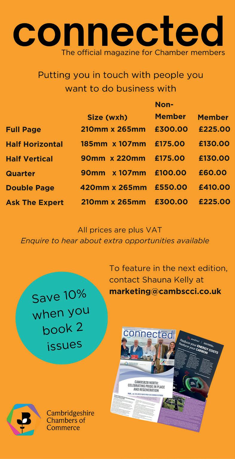 Views expressed in connected are not necessarily these of Cambridgeshire Chambers of Commerce. Acceptance of advertisements does not imply official endorsement of the products or services concerned. Whilst every care has been taken to ensure the accuracy of editorial content, no responsibility can be taken for any errors and/or omissions. The editor reserves the right to make amendments without notification. CELEBRATING WOMEN