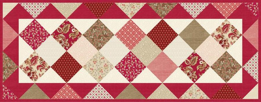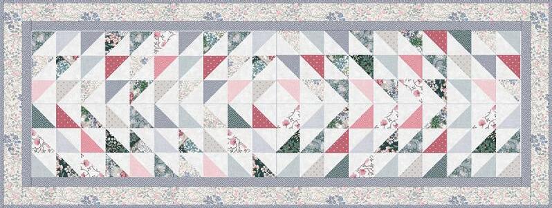 All the charm of patchwork without any of the work! The exciting “cheater” print of half-square triangles means you’ll have a runner and six placemats in no time at all!
