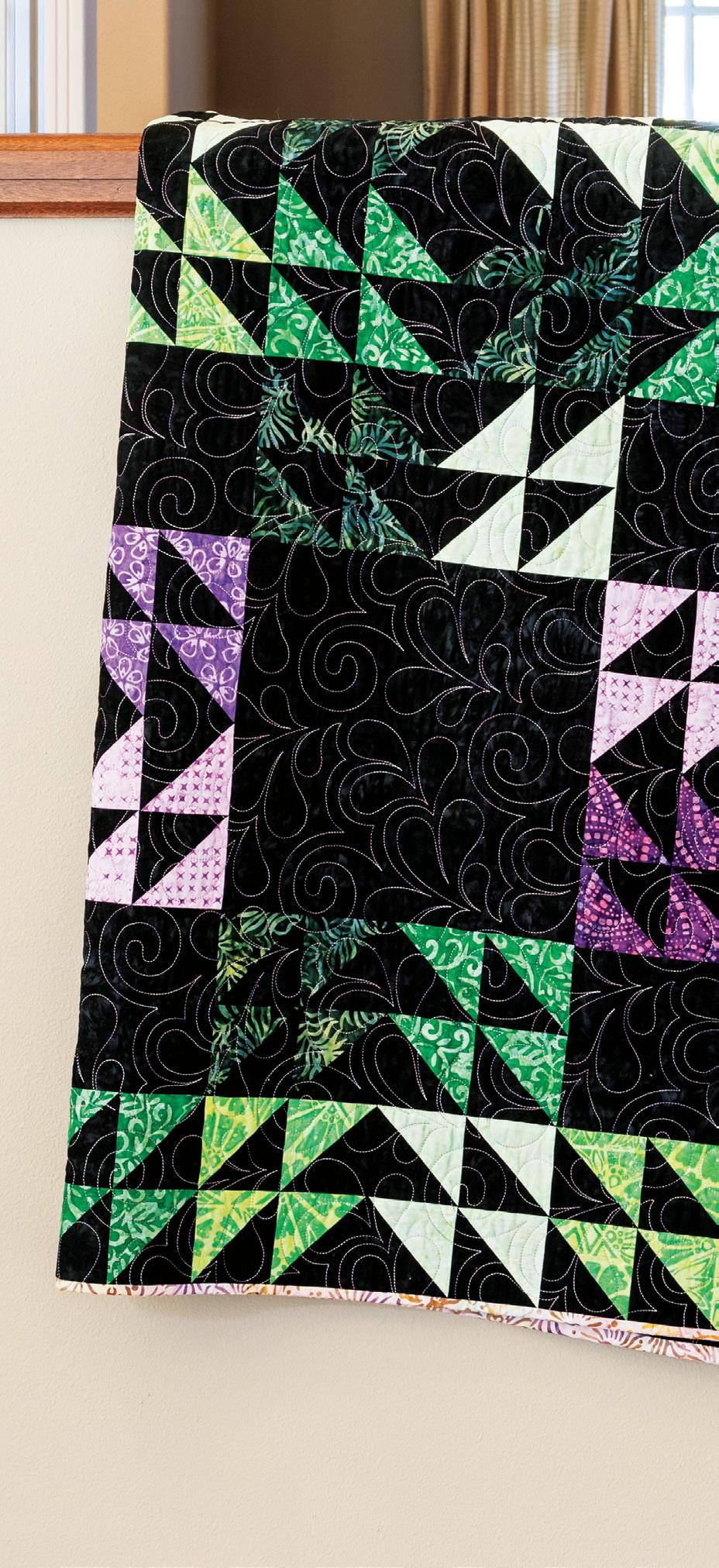 If piecing is your pleasure, take delight in our Southern Belle showstopper. Lots of triangle treasures make a dynamic setting for traditional blocks with movement to spare. Perfectly suited to the cozy prints from our Blueberry Parfait collection.