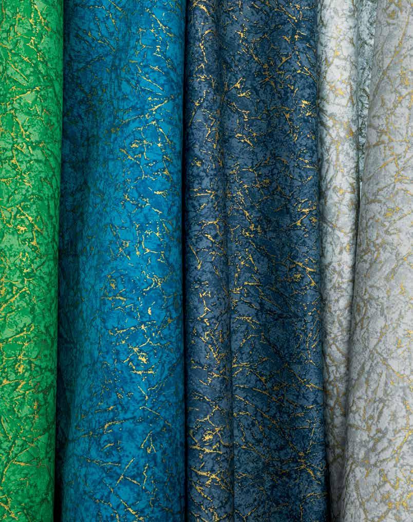 Neutral greys, vivid greens and a sky’s range of blues create a calming mix of cool tones while maintaining metallic gold veining in each.