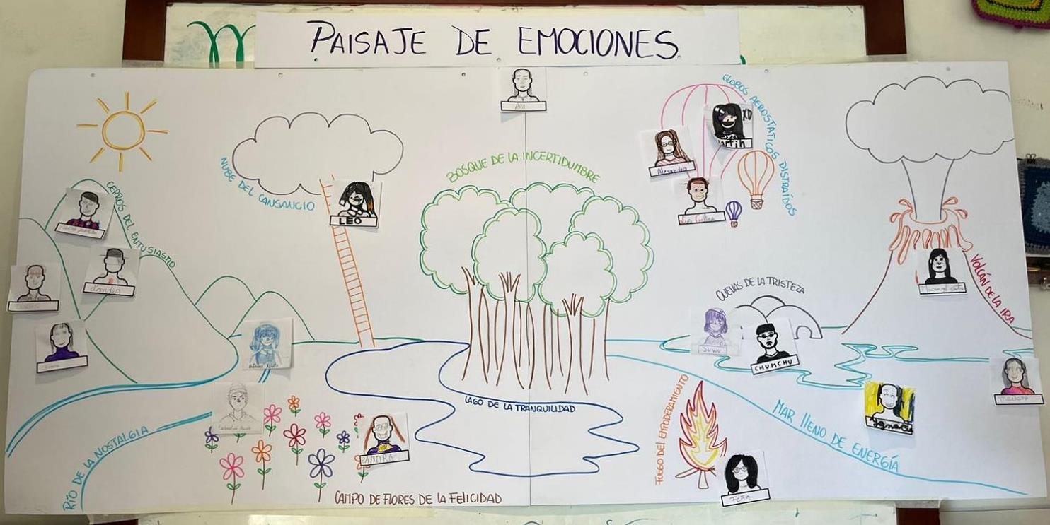 A cada NNJ se le entregó un dibujo de persona (avatar) para que se dibujaran ellos/as mismos/as. Luego, ubicaron su avatar en el Paisaje de las Emociones (dibujado en un papelógrafo) según su estado anímico del momento.