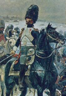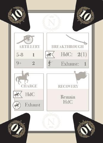 The 5th Reserve makes a breakthrough attack, drawing 1 card and checking its breakthrough section. The result is “exhaust 1”. It exhausts and inflicts 1 demoralization on the French. The disrupted Guard Cavalry decides to defend against the attack and makes a breakthrough check of its own. The result is “HdC 2(1)”. Because the cavalry is defending, the parenthesized result is used (6.12.2). The breakthrough attack is defeated. The Guard Cavalry would ordinarily be sent to the Hors de Combat card, but because it has the Guard symbol the result is no effect (2.3.13). The French army receives the one demoralization inflicted at the end of the battle, but the West Reserve will not be put out of command next turn because the breakthrough was defeated.