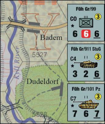 The effectiveness of the initial German artillery support varied by sector. 176 After identifying all participating units for each attack on 16AM, the German player rolls one die for each participating artillery unit to determine its accuracy. In the Sixth Panzer Armee sector, a die-roll of “1-2” = use the higher barrage strength (right-hand number), a “3-6” = use the lower barrage strength (left-hand number). In the Fifth Panzer Armee sector, a die-roll of “13” = use the higher barrage strength (right-hand number), a “4-6” = use the lower barrage strength (left-hand number). All German artillery units in the Seventh Armee sector use the higher barrage strength (right-hand number). Use these results and the Combat Modification Chart to compute the initial and final combat odds for each opening attack.