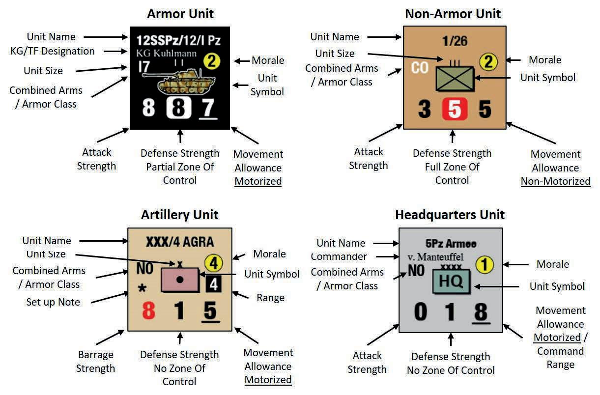 Unit Types. Combat units are classified by type as either motorized (with an underlined movement allowance) or non-motorized (with a non-underlined movement allowance). Armor unit counters have silhouettes printed on them; non-armor units have a unit symbol.