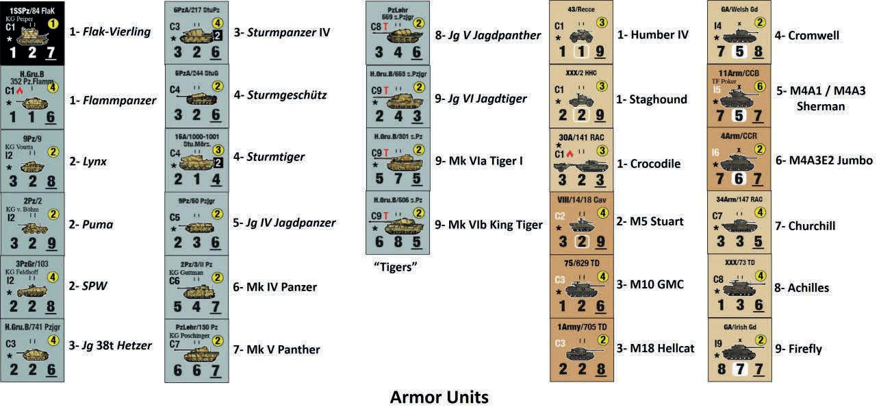 Armor Units. These represent formations of tanks, assault guns, armored cars, half-tracks and other armored fighting vehicles. German tanks were typically known as “panzers.” Fullstrength armor battalions possess 20-60 armored fighting vehicles. Full-strength armor brigades and regiments possess 50-100 armored fighting vehicles.