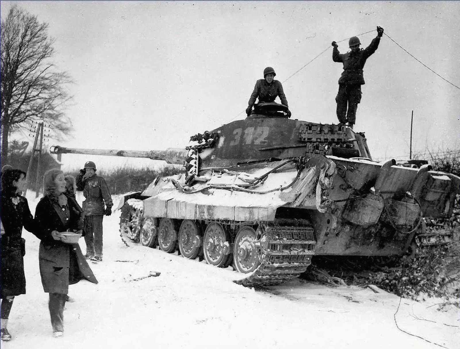 Belgian maidens walk past Königstiger 312 of s. SS Pz Battalion 501 (SS Oscha. Heinrich Ritter) that was knocked out by M-36 tank destroyers of the 628th TD Battalion near Goronne, Belgium [3616], 7 January, 1945. (NARA)