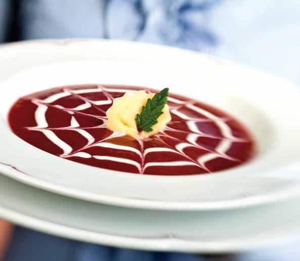 > Disporre lo yogurt naturale in una tasca da pasticceria e distribuirlo delicatamente in modo decorativo sulla minestra.