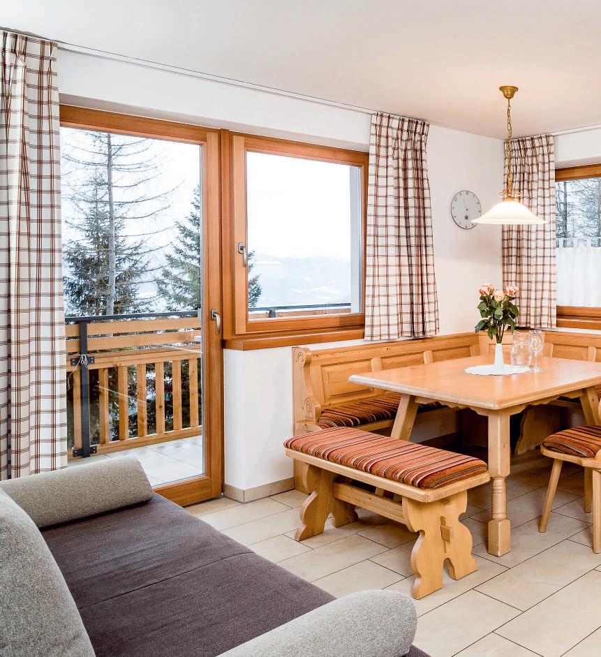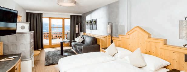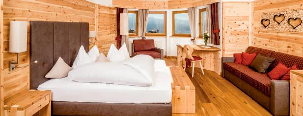 s uite per famiglie con balcone baciato dal sole e vista su prati e boschi dotata di angolo sofà separabile, arredi in legno di rovere naturale, parquet, scrivania, t V 40 ” con canali sat., telefono, frigobar, cassetta di sicurezza, doccia a pioggia, WC, bidet, fon e wifi gratuito. i n st anza trovate anche uno zaino per le vostre escursioni, accappatoi e ciabatte per la spa. Camera non fumatori