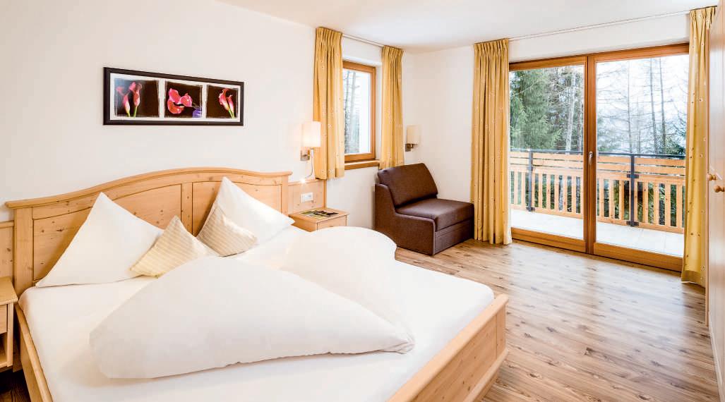 Camera matrimoniale in stile tirolese con arredi in legno di cembro, divano, telefono, radio, t V 40 “ con canali sat., cassetta di sicurezza, doccia a pioggia o vasca da bagno, WC, bidet & fon, wifi