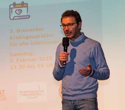 mich persönlich ist der Kern der Brunecker Krebsgespräche das Gespräch mit den Patienten. Es braucht Mut dazu, nicht jeder könnte das. Aber die Geschichte aus erster Hand präsentiert zu bekommen, das betrifft, das macht verständlich, was in diesen Menschen vorgeht, das macht Mut. Krebs ist tragisch, auch wenn es gut ausgeht, hinterlässt er seine Spuren. Es ist kein Thema, das einfach abgehakt werden kann. Aber ich hatte den Eindruck, dass bei unserer Tagung doch auch eine gewisse Leichtigkeit mit ins Spiel kam, auch ein Lachen. Sehen, wie diese Menschen, Klaus Gasperi, unser Gast vom letzten Jahr, Walther Lücker oder die Ärztin Barbara Mair im Leben stehen, ihr Leben nach dem Krebs, mit dem Krebs meistern, das nimmt Ängste und zeigt gleichzeitig: Krebs geht uns alle an! •