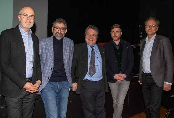 Auf dem Podium des UFO in Bruneck die Primare der Onkologie Bozen, Dr. Carlo Carnaghi, des Dienstes für Anatomische Pathologie und Histologie, Dr. Guido Mazzoleni, des Zentralen Internistischen Day-Hospitals Meran, Dr. Manfred Mitterer, der Abteilung Innere Medizin am Krankenhaus Bruneck, Dr. Stefan Brugger, der Hausarzt und Facharzt für Anästhe-
