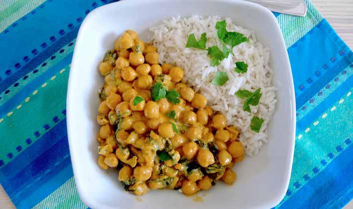 5. Anschließend die Spinatblätter für 2–4 Minuten zugedeckt mitkochen, bis diese zusammengefallen sind. Mit der Kokosmilch aufgießen, gut umrühren und für wenige Minuten erhitzen lassen.