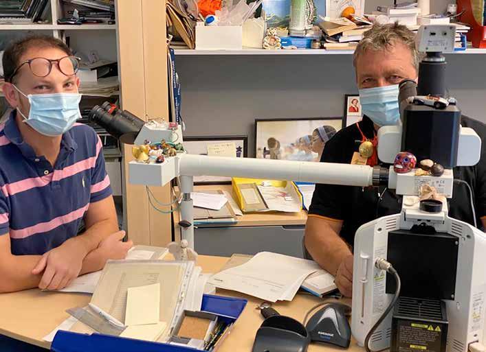 Dr. Guido Mazzoleni und ein Mitarbeiter an ihrem Arbeitsplatz am Mikroskop