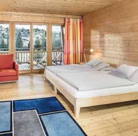 Cosy, individually-designed rooms made entirely from wood (min. 44m²) featuring a bathroom with bath/shower and bidet, and a balcony with garden view. Amenities include: minibar stocked with mineral water, spa bag with bathrobe and slippers, Sat-TV, safe, telephone, and complimentary Wi-Fi.