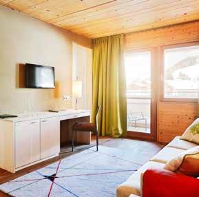 Sunny, individually designed room made entirely from wood (min. 35m²) featuring a glass-walled bathroom with bath/shower and bidet, balcony or terrace with view of the Dolomites. Amenities include: minibar stocked with mineral water, spa bag with bathrobe and slippers, Sat-TV, safe, telephone, and complimentary Wi-Fi.