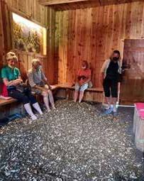 Beim Bergila in Issing besichtigten wir die Latschenölbrennerei und fanden schattige Plätzchen im Kräutergarten. Im Bild unsere liebe Martha.