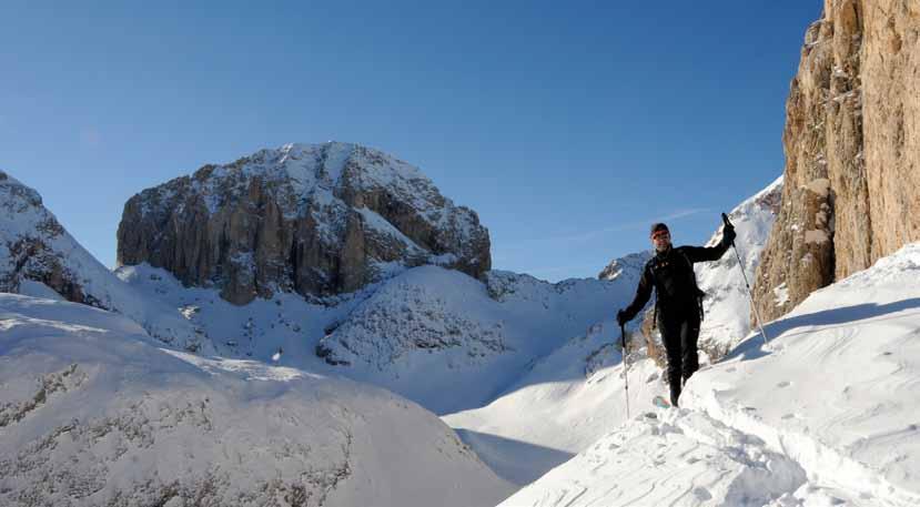 di vista tecnico, ma necessita di una notevole esperienza alpina e condizioni d’innevamento sicure; inoltre richiede proporzionalmente un maggiore impegno, bisogna affrontare salite più lunghe prima di conquistare il “premio”, costituito da magnifiche discese sulla neve farinosa. Mettere e togliere quattro volte le pelli di foca richiede parecchio tempo: per questo, dice Helmuth, bisogna calcolare una durata totale compresa tra le 6 e le 8 ore.